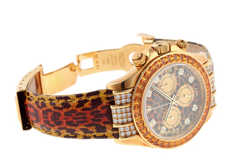 ベゼルには36個のコニャックサファイア、インデックスに8個、フラッシュフィットには48個のダイヤモンドがセットされた特別仕様。