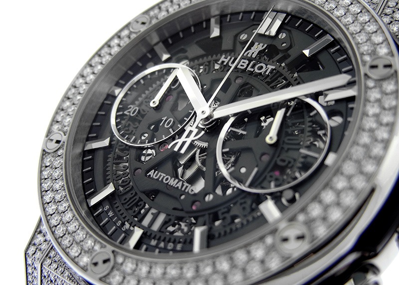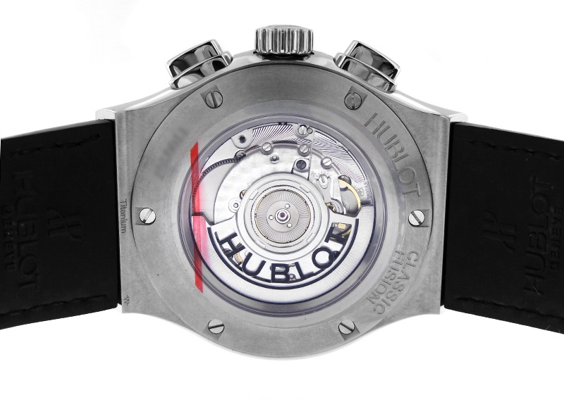 裏面もシースルーバックとなっており、前からも後ろからも、ウブロのメカニカルな機械構造を堪能できます。