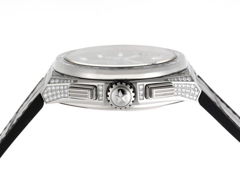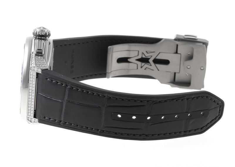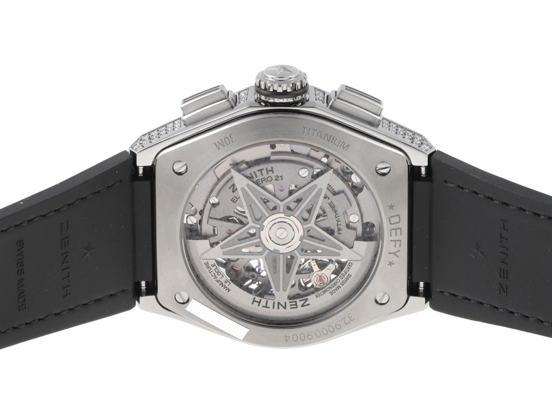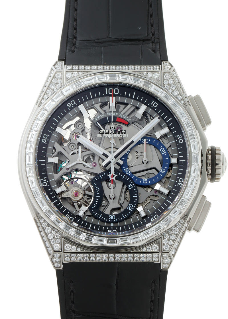 ゼニス「デファイ エルプリメロ 21」。 デファイは1960年代に人気を誇りながらも廃盤となったコレクション。 挑戦、革新をキーワードに、新しいデファイはただのリバイバルではなく、その機構と意匠を新たに生まれ変わりました。 ゼニス社が誇る伝説的高速クロノグラフムーブメント「エルプリメロ」の新型自社製キャリバー " エル・プリメロ 9004 "新しく開発されたそのムーブメントは複雑な機構を取り入れ、 その性能をさらに向上させ、1/100 秒の精度の実現や耐久性・耐磁性など飛躍的進歩を遂げました。 デファイ エルプリメロ 21はそのグレードアップした新型ムーブメントを搭載 チタンは軽量で強度にも優れているため日々ご愛用いただくのにぴったりです。 メカニカルなダイアルが男心をくすぐり、チタンケースでストレスのない着用感を感じていただけます。 そしてラグジュアリーモデルにふさわしく、ケースには288個ものブリリアンカットダイヤモンド、 またベゼルには44個のバゲットカットダイヤモンドがセットされた贅を極めた一本です。 秒針にはブランドシンボルの星、クロノグラフ パワーリザーブ インジゲーター、 そしてスモールセコンド、60 秒積算計、30分積算計が備わり、スケルトンダイアルによって そのムーブメントの存在をより感じられるものとなっております。 管理用:FI-31
