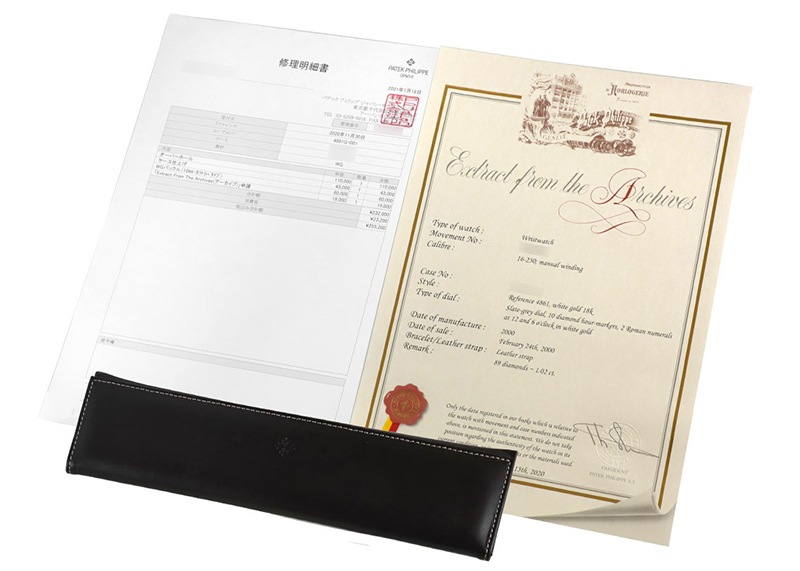 アーカイブ、パテックフィリップの修理明細書が付属をします。別途、当店のオリジナルボックスをお付けします。