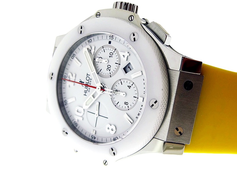 ウブロの人気シリーズビッグバンの生産終了モデル「ビッグバン サンモリッツ」が入荷しました。 「異なる素材」と「伝統と未来」の『融合(フュージョン)』をテーマとしたウブロの「ビッグバン」シリーズ。 こちらは、ステンレススチールとホワイトセラミックを組み合わせた 既に生産終了となっている希少モデルです。 ベゼル・文字盤・インダイヤルもすべて白で統一され、とても爽やかで軽く洗練された印象。 唯一赤で配されたクロノグラフ秒針がアクセントとなり目を惹きます。 セラミックは強度が高いだけでなく耐食性も高いため錆びにくく変色等も起こりにくいのが特徴です。 真っ白な美しさをずっと楽しんでいただけます。 商品状態はオーバーホール、外装の傷取り(研磨)を行っており、ストラップは新品に交換済み。 ホワイトの時計はどんな色のベルトも似合いますので ベルトで遊ぶのもお薦めです。 今回は、柔らかく快適な着け心地で高品質のラバーストラップを製作するマイアミ発のウォッチストラップ専門ブランド「HORUS STRAPS」イエローを装着しています。 付属品として箱、保証書(2016年12月)がございます。 さらに詳しい内容を確認されたい方は、お気軽にお問い合せ下さい。