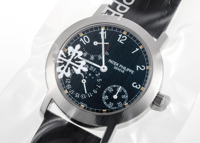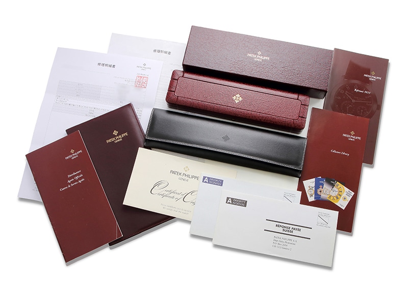 プチコンプリケーション パワーリザーブ ムーンフェイズ「5055G-001」の入荷です。 1997年発表当時、コンプリケーションモデルに於いてモダンなデザインとして人気を博したモデルです。 アシンメトリーなデザインコードは「3712 ノーチラス プチコンプリケーション」に引き継がれ、現行モデル「5712 ノーチラス プチコンプリケーション」にも継承されています。 ムーブメントはマイクロローター採用の「Cal.240PS IRM C LU」を搭載しており、5712プチコン同様に実力は折り紙付きです。 商品状態は パテックフィリップ社で分解掃除(オーバーホール)、研磨作業を含むコンプリートサービス及び、レザーストラップの交換を実施。 最高の状態でお客様へお渡しするため、メンテナンス後は未開封の状態となっております。 新しく生まれ変わった特別な時計を手にできるのはご購入された方のみ。 パテックフィリップ社でメンテナンスをすることで、「他には無い高品質のタイムピース」が出来上がり、初めて手にされる方も安心してお使い頂けます。 世界最高峰ブランドの「メンテナンス後ファーストオーナー」になってみてはいかがでしょうか。 付属品は全て揃っており、国際保証書の日付は 2002年1月です。 他、パテックフィリップの修理明細書(2023年5月まで保証)がございます。 さらに詳しい内容を確認されたい方は、お気軽にお問い合せ下さい。 管理用:owi566
