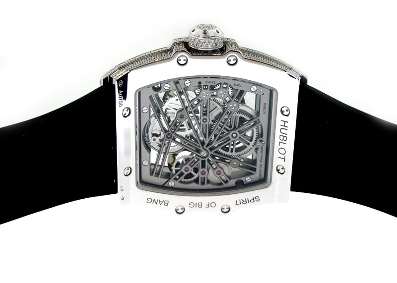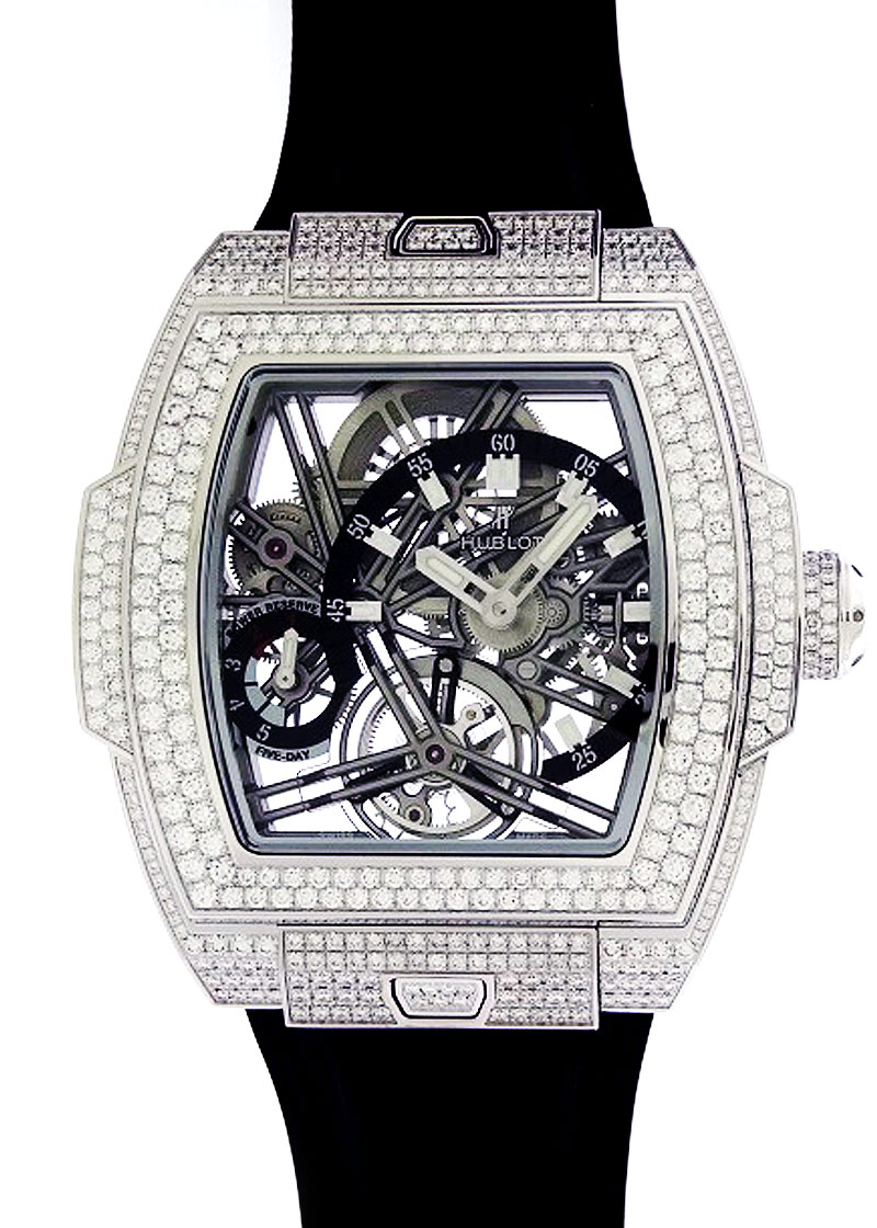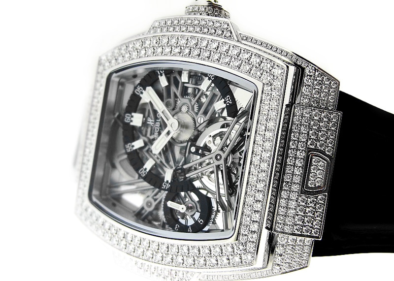 ウブロより、スピリットオブビッグバンの限定品が入荷しました。 ウブロ唯一のトノー型(樽型)ケースのシリーズ、スピリットオブビッグバン。 今回入荷したのはその中で最高峰ともいえるトゥールビヨン、かつホワイトゴールド素材のケースダイヤという世界で2本しか存在しないレアモデルです。 キャリバーはHUB6020。手巻きのスケルトントゥールビヨン。 パワーリザーブは約5日間で、8時位置のダイヤルで残量が確認できます。 インデックスとパワーリザーブ表示は黒いリング上に示され、視認性も確保。 6時位置にトゥールビヨン、12時位置には手巻きのゼンマイをしっかりと見ることが出来、 回転するトゥールビヨンやゼンマイが巻き上がっていく様子を見る事が出来る、機械好きにはたまらないディティールとなっています。 ケースにはダイヤがより映えるホワイトゴールドを使用。 ウブロにはケースダイヤのモデルがいくつもありますが、こちらのモデルはケースサイドの隅々にまでダイヤが敷き詰められている特別仕様です。 しかもベルトはウニコと同じ簡単に着脱できる仕様となっているため、気軽に雰囲気を変えて楽しむ事が出来ます。 世界に2本しかない希少モデル、ぜひ一度ご覧くださいませ。 商品状態は正規未使用品で、箱・保証書が付属いたします。 さらに詳しい内容を確認されたい方は、お気軽にお問い合せ下さい。 参考定価:19,250,000円