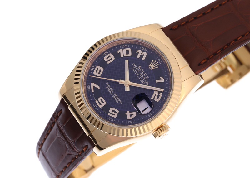 ロレックス「オイスターパーペチュアル デイトジャスト」の中古品が入荷いたしました。 1945年に登場したデイトジャストは、ロレックス三大発明のオイスターケース・パーペチュアル(自動巻)・デイトジャスト(瞬時日付切り替わり)の全てが備わっています。 生産終了モデルで珍しいブルーコンセントリックアラビア文字盤が特徴で、深みのあるブルーはイエローゴールドケース、さらにブラウンのクロコダイルストラップと相性抜群。 腕なじみの良い36mmのケースサイズは幅広い年齢層から多くの支持を得ています。 金無垢素材のエレガントな重厚感とアラビアインデックスのカジュアルな雰囲気が絶妙なバランスを生み出しています。 日本ロレックスにてオーバーホール(分解掃除)、外装の傷取り(研磨)、ガラス・リューズ・クロコダイルストラップ交換が完了しておりコンディション良好です。 ケース1時位置に打痕がございますが、フルーテッドベゼルの輝きにより目立ちにくくなっております。 日本ロレックス発行のサービス保証書と修理明細書が付属し、腕周りサイズ16.5~19.0cmまで対応可能です。 詳しい内容を確認されたい方はメール・お電話にてお問い合わせください。 管理用:owi882