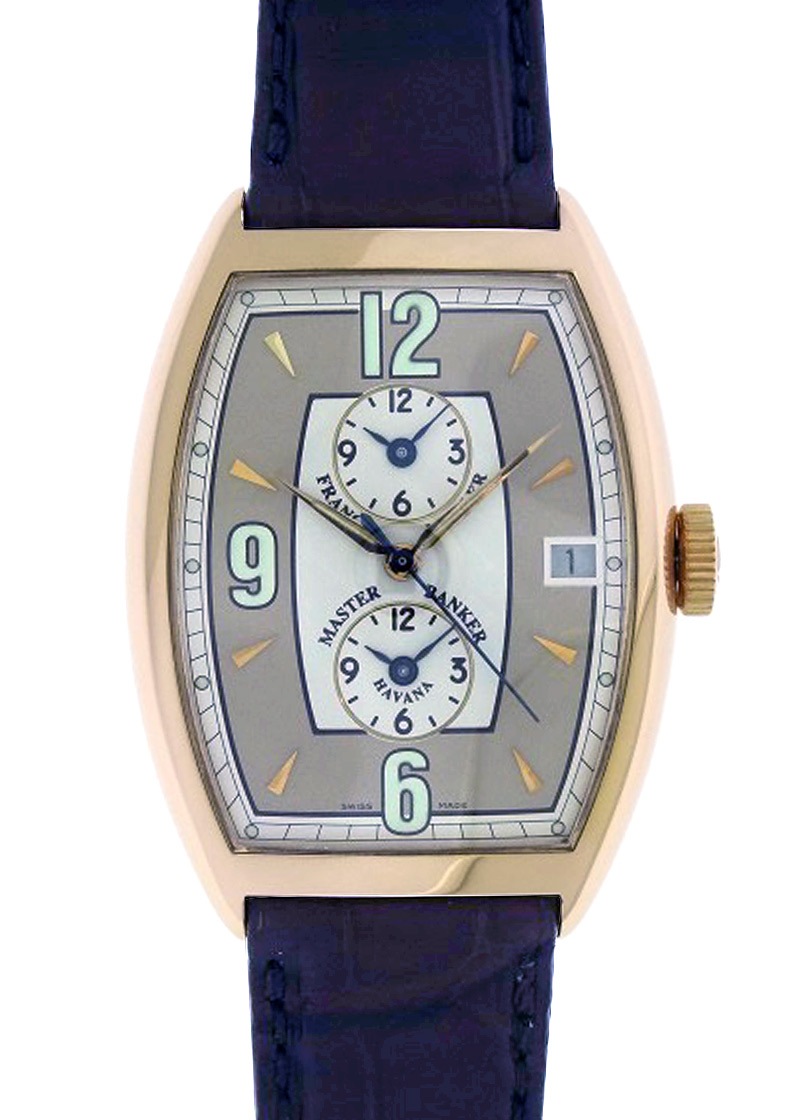 フランクミュラーより、「マスターバンカー ハバナ」が入荷しました。 マスターバンカーは、フランクミュラーが銀行マンの友人から「世界の金融市場の時刻を瞬時に分かる時計を作って欲しい」という依頼を受け、2年の歳月をかけて製作した時計です。 一般的なGMT機構とは一線を画すこの時計は、複雑な構造をシンプルな設計に創り変えるというフランクミュラーの設計の美学が詰め込まれたものとなっています。 通常のGMTは2ヵ国の時刻を示すものの、うち1カ国は時差を反映させた時針で示すのが一般的です。 対してマスターバンカーは、3ヵ国分の時刻をそれぞれ時針と分針を用いて“分まで”正確に表示します。 しかもその操作を行うのはリューズ1つのみというシンプルさで、この仕組みは特許を取得しています。 また、デザインとしてこの“ハバナ”シリーズはその名の通りキューバの首都ハバナが舞台となっており、生産本数も少なく非常に実用的でありながら芸術的な一本でもあります。 スペイン統治時代の街並みが残るハバナは、その後大発展したアメリカ経済に伴い、セピア色の街並みの中 夜にはコニャックにハバナ産の葉巻をたしなむ 映画の中の様な美しい街。 独特なピンクベージュと2タイプの仕上げが施されたシルバーのダイヤル、楔形インデックスとアラビア数字の強い夜光は、その土地の風土や歴史背景を愛するフランクミュラーならではの、ハバナの街並みを落とし込んだような美しいデザインです。 商品状態はメーカーにてオーバーホールを実施。ストラップも新品に交換済みの大変綺麗なお品です。 国際保証書(2000年7月)とメーカー修理明細書、ハバナ名産の葉巻を模した特別仕様の箱が付属いたします。 さらに詳しい内容を確認されたい方は、お気軽にお問い合せ下さい。 管理用:owi725