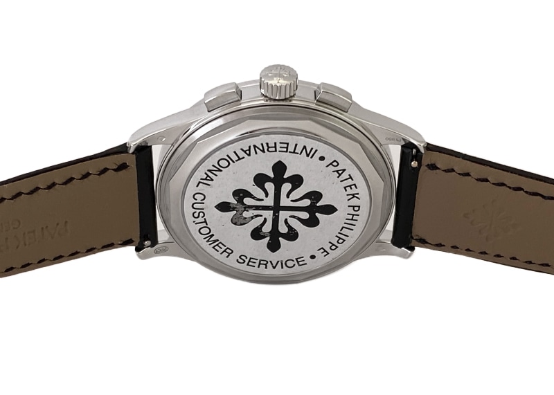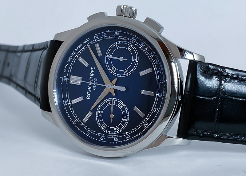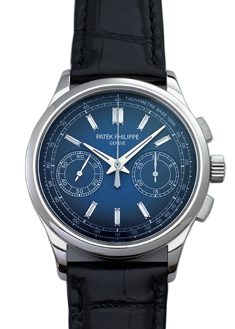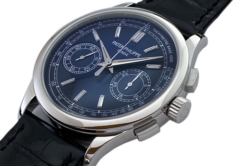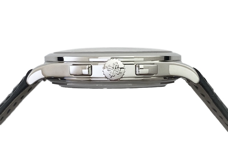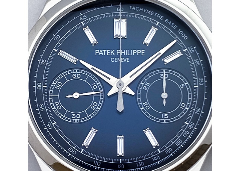 名門パテックフィリップより「5170P-001」が入荷しました。 2017年発表、手巻きクロノグラフのプラチナモデルです。 それまでレマニア社製クロノグラフムーブメントを搭載していたパテックフィリップの、初めての完全自社製手巻きクロノグラフムーブメントCH29-535 PSがポイント。 2010年に5170シリーズで初めて搭載され、現行モデルにも使われている基幹ムーブメントです。 コラムホイール・水平クラッチを用いたクラシックなクロノグラフ機構で、さらにダイナモメトリック・リュウズという仕様になっています。 これは香箱が完全に巻き上げられるとリュウズとの連結を外すというもので、手巻きながら 巻きすぎによるゼンマイ切れを起こすことがない安心の仕様です。 文字盤は端に向かって青から黒に近い色へグラデーションが美しいブルーブラック文字盤。 インデックスには贅沢にバケットダイヤが使われていますが、一見 バーインデックスと見まがうほど文字盤に溶け込みいやな主張をしません。 かなり細め・長めなダイヤカットで、ギラギラ感は無く 品よく高級感をもたらしている為、今までダイヤのモデルをさけていた方にこそお薦めいたします。 インダイヤルでスモールセコンドと積算計、外周にはタキメーター、パワーリザーブは約65時間と機能面も折り紙付きです。 商品状態は パテックフィリップにてメンテナンス後、未使用の状態。2024年まで保証期間があるので、より安心してご使用いただけます。 付属品は箱、保証書(2019年3月)、修理明細書(2022年3月)がございます。 さらに詳しい内容を確認されたい方は、お気軽にお問い合せ下さい。 ※生産終了モデル 管理用:II-469