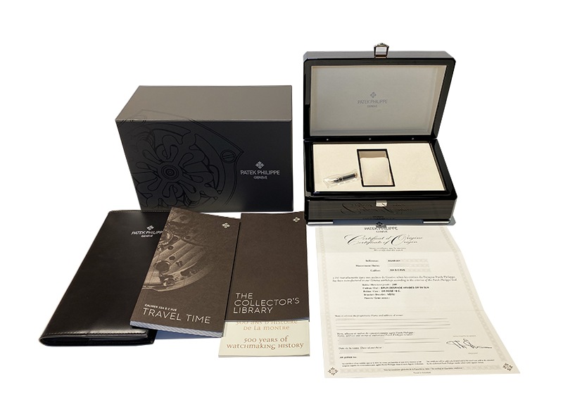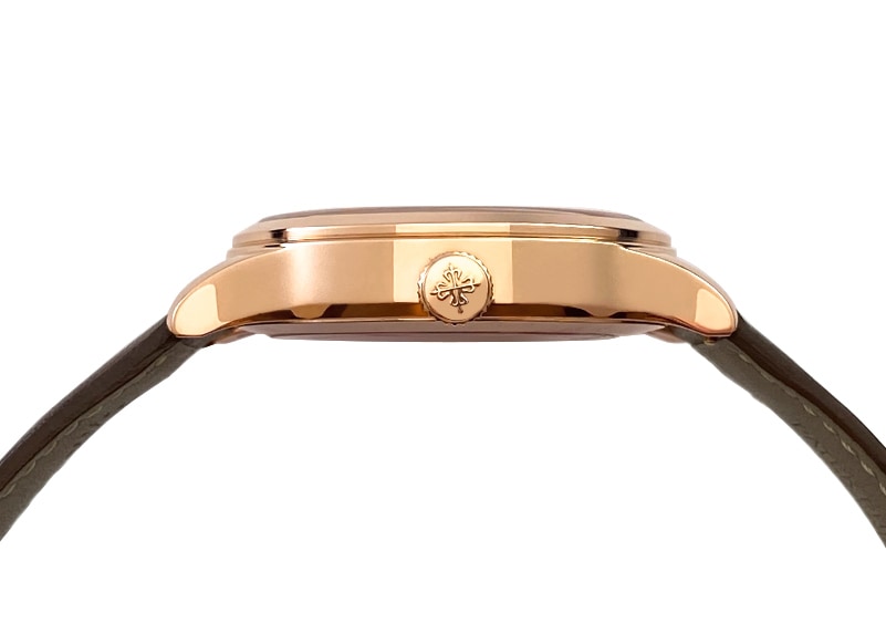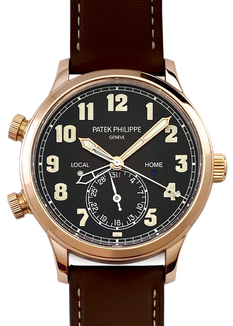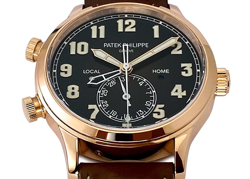 名門パテックフィリップより珍しいミリタリーテイストなカラトラバ「5524R-001」が入荷しました。 ”カラトラバ パイロット トラベルタイム”は2015年にホワイトゴールドモデルが発表され、これまでにない厚みやボリューム感、ミリタリーテイストなデザインが話題となりました。 こちらは2017年に発表されたローズゴールドモデルで、ブラウンからブラックへグラデーションする深い色味の文字盤によりさらに重厚感が増した印象です。 他のモデルには無いほどしっかりと夜光が施された 太いアラビア数字と針も大きな特徴でパイロットウォッチとしての視認性の高さの重要性をしっかりと押さえています。 メインの時針で第一時間帯、スケルトン針で第二時間帯を表すGMT機構を搭載。 どちらも12時間計とし、それぞれに昼夜窓表示を設けてある非常に見やすい仕様です。 これぞパテックというのがそのGMT機構の時刻合わせの容易さで、リュウズの位置を迷うこともなくプッシュボタンを押すだけ。 本来難しい操作をいかに簡単に提供するかはパテックの理念でもあります。 その為には当然内部構造は複雑化しますが、そこを実現するのがパテックフィリップの技術力。 パテックはこれをあえてGMTではなく“トラベルタイム”と呼び、複雑機構のカテゴリーである“コンプリケーション”にラインナップしています。 パイロットウォッチということもあり、防水性能は他のカラトラバより高い60m防水を確保。パワーリザーブは約40時間です。 また、5524にはほぼ同じデザインで作られた 女性用初のトラベルタイム7234が存在するため、ペアウォッチにしていただくことも出来ます。 僅かに擦れ等ございますが非常にきれいな状態。ストラップに若干使用感があるため現在新品ストラップを手配中、交換ののちご納品の予定です。 付属品は箱・国内正規保証書(2018年12月)がございます。 USED品は個体により状態が異なります。 写真をご参考の上、さらに詳しい状態については お気軽にお問い合わせくださいませ。 管理用:owl525