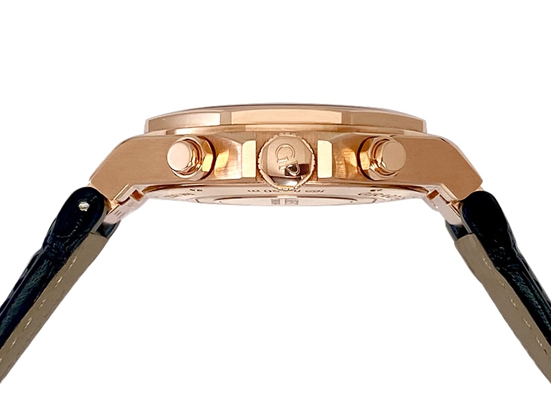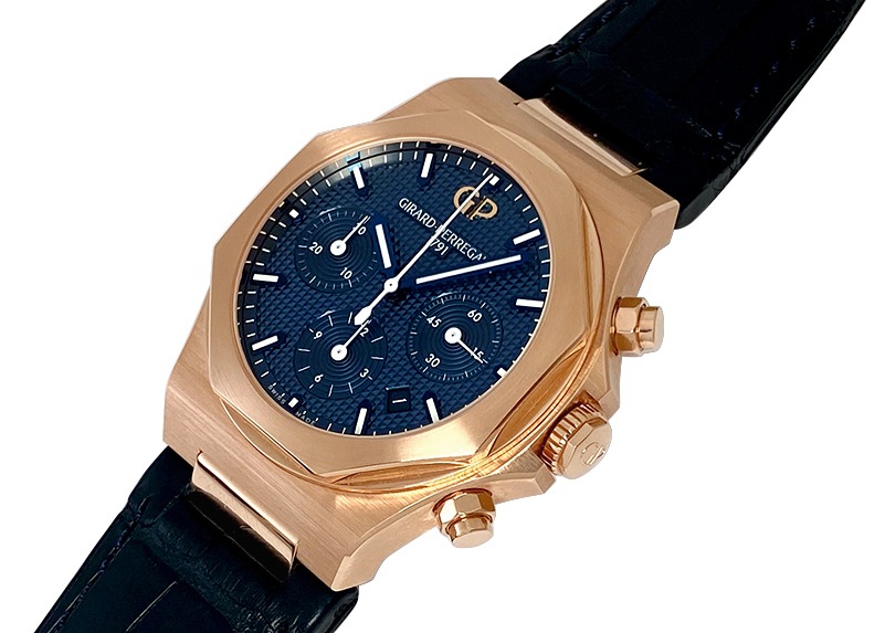 ジラールペルゴより「ロレアート クロノグラフ」が入荷しました。 ジラールペルゴを代表するアイコンウォッチ「ロレアート」は、ロイヤルオークやノーチラスと同年代の1975年にクオーツ時計として発表。 クオーツショック只中に 新しい要素を取り入れ打開を図ったという意欲溢れる歴史を持ちます。 ラグを廃したケースのラインから繋がる一体化されたブレスレットや直線的なエッジと曲線的なラインを組み合わせたオクタゴンのケース、ポリッシュとサテンを組み合わせた繊細な仕上げなどが特徴。 現代のトレンドである「ラグジュアリースポーツ」をいち早く取り入れた スポーティーでありつつエレガントな魅力があります。 今回入荷したのはピンクゴールドに深いネイビーを合わせたラグジュアリー感の高いモデル。 インダイヤルもストラップも同じネイビーで統一感があり、ジラールペルゴの赤味の強いピンクゴールドがとても映えて華やかです。 クルドパリ模様のギョーシェ文字盤など 伝統と技術の高さがもたらす上品な美しさがありつつ、太めの針や夜光により視認性も抜群です。 レザーストラップの為フォーマル感もあり、普段使いにもしっかりとした装いにもお使いいただけます。 商品状態は、購入後一切使用していない未使用品。ストラップもディスプレイ時に穴を通した痕のみで、未使用の綺麗な状態です。 付属品は箱、国内正規保証書(2022年11月)がございます。 メーカーも保証も残っているためより安心してご使用いただけます。 さらに詳しい内容を確認されたい方は、お気軽にお問い合せ下さい。 管理用:ii-527
