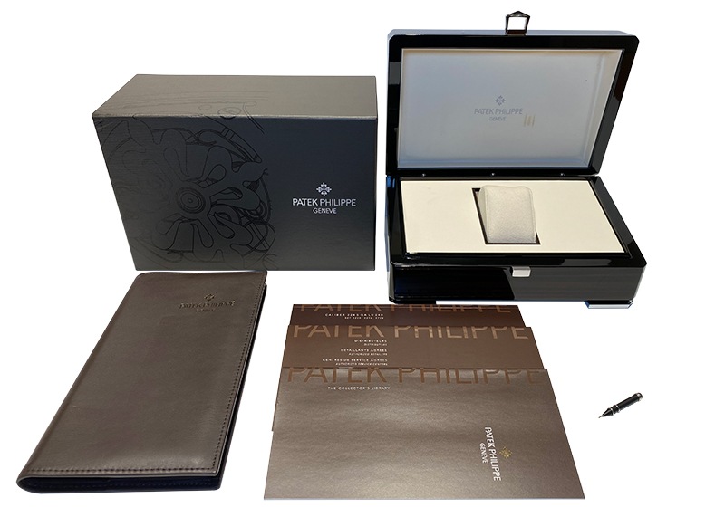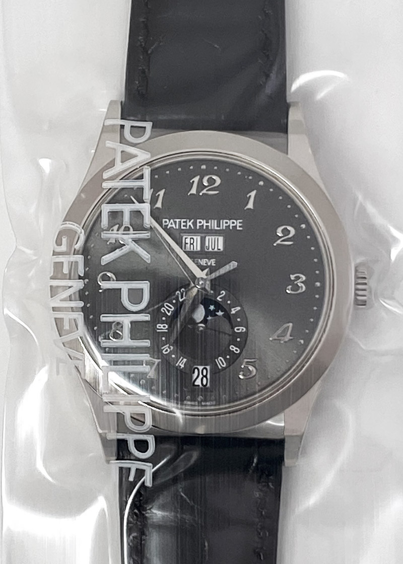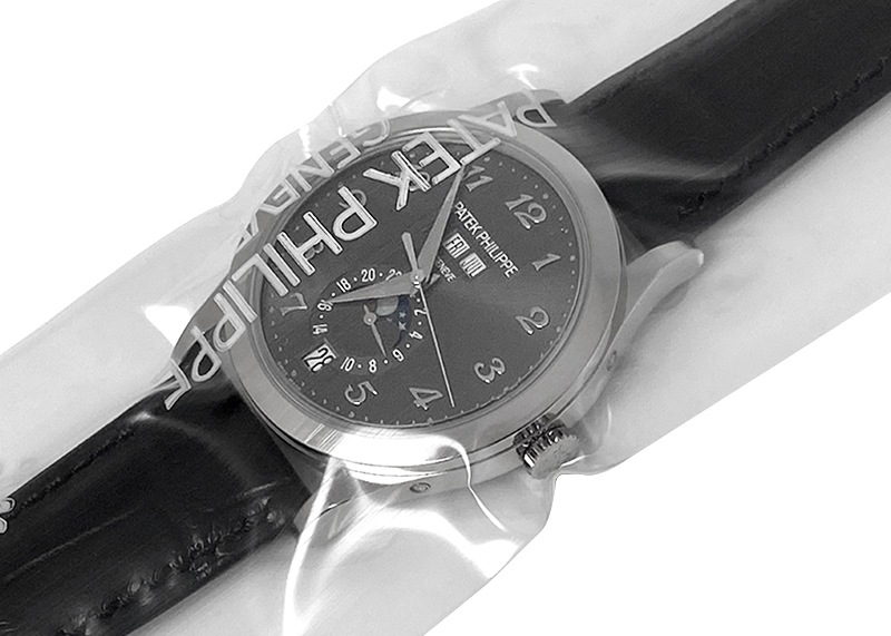 機械式時計の最高峰パテックフィリップより、年次カレンダーとムーンフェイズを搭載した「5396G-014」が入荷いたしました。 年次カレンダーとは、自動で大の月小の月の計算・調整を行うカレンダー機構の事で、自ら日付調整が必要なのは2月末から3月1日にかけての年1度だけ。 パテックフィリップが開発・特許を持つ機構で、その発表20周年を記念して発売されたのが、今回入荷した5396G-014です。 パテックフィリップの年次カレンダーモデルは大きく分けて3パターンあり、こちらは月と曜日を横並びの2ディスクで窓表示する5396系。 年次カレンダーや永久カレンダーでは文字盤上に並んだ月・曜日などそれぞれを表すいくつものダイヤルから日時を“読み取る”必要があるモデルが多い中、 日・月・曜日それぞれを窓で表示、さらにムーンフェイズの周りには24時間表示も搭載され、一目で日時がわかる視認性の高さが特徴です。 また、5396系は、1962年から1981年にかけて製造された初の自動巻き永久カレンダー「3448」をデザインの基にしています。 記念モデルとしてふさわしいデザインであり、このチャコールグレーの文字盤とブレゲ数字のインデックスは他にはない貴重な組み合わせです。 ミニッツマーカーは実は一つ一つ彫られた凹型をしており、普通にみると目の錯覚で浮き上がって見えます。 このようなよくみないとわからないような細部までこだわるのがパテックフィリップのこだわりとクオリティです。 搭載されているのは自動巻きCal.324 S QA LU 24H/303で、パワーリザーブは最大45時間、もちろんパテックフィリップシールの認定。 シースルーバックのため、裏側から21金ゴールドローターやその精密かつ美しい動きを堪能できます。 また、曜日や日付それぞれプッシュピンを用いて単独操作ができる操作の簡易さも パテックフィリップの重要なポイントです。 こちらの商品は、パテックフィリップでのオーバーホール、研磨作業を含むコンプリートサービスが完了しています。 レザーベルトも新品の純正ベルトに付け替えており、サービス完了後は真空パックの状態でご納品となります。 お客様ご自身で未開封の真空パックを開封していただき、これからお客様と共に始まる、新しいアニュアルカレンダーの世界を是非ご堪能ください。 付属品は、箱・パテックフィリップの修理明細書(2023年7月)がございます。 2019年に生産終了となった希少モデルです。ぜひこの機会にご覧ください。 USED品は個体により繊細に状態が異なりますので、さらに詳しい内容を確認されたい方はお気軽にお問い合せ下さい。 ※生産終了モデル 管理用:owm297