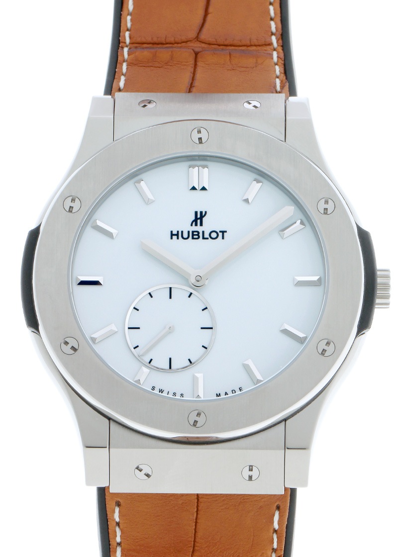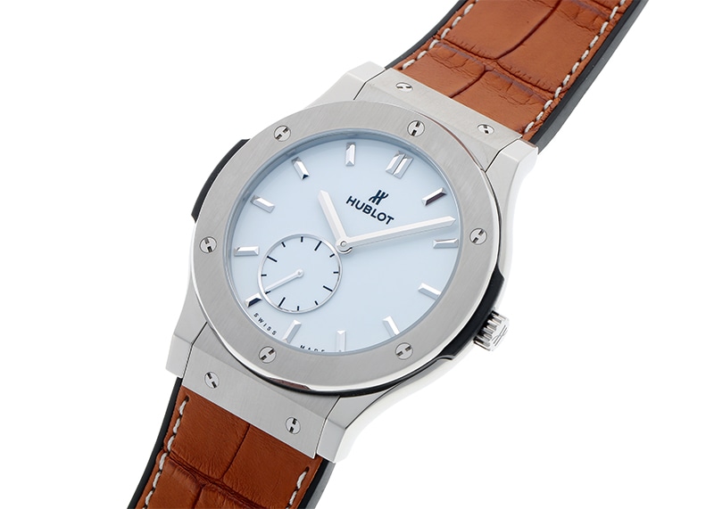 ウブロより、人気シリーズ 「クラシックフュージョン クラシコ ウルトラシン」が入荷しました。 “融合”がテーマのクラシックフュージョン。これまで新しい素材や、様々なブランドとの革新的な融合を次々と果たしてきました。 デザイン上の特徴は船の舷窓をイメージしたビス止めされたベゼルとラグ一体型の形状があげられます。 こちらは、今やウブロの定番となっているケース素材にチタンを用いたモデル。 マットな白文字盤にアプライドインデックスがキラキラと輝いています。 搭載されている手巻きムーブメントはCal.1301。シースルーバックの裏面からご覧いただけます。 ストラップは高級感あるアリゲーターの見た目ながら裏面にラバーを裏打ちし、汗など湿気に耐性を持たせたラバーアリゲーターで実用性も抜群です。 比較的大きな45mmケースは存在感がありますが、かなり厚みが抑えられているモデルですのでカジュアルシーンだけでなく、ビジネスシーンにもご利用いただけます。 さらに詳しい内容を確認されたい方は、お気軽にお問い合せ下さい。 管理用:own014
