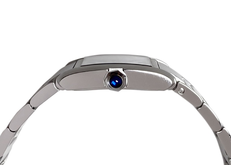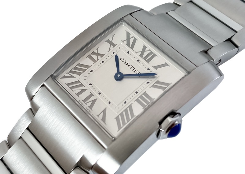 カルティエの人気シリーズタンクから、新型「タンク フランセーズ MM」が入荷しました。 一番最初に腕時計を作ったカルティエが、タンクシリーズを初めてデザインしたのが1916年。 戦車を上から見た様子にインスピレーションを受けたタンクは、ラグと一体化した並行に伸びる縦枠が特徴のカルティエを代表するシリーズで、フランセーズをはじめ多くの派生モデルがあります。 タンクフランセーズは1997年発表で四半世紀にわたり発表時のまま展開されてきた人気モデルですが、2023年に初のモデルチェンジが行われ、その新型モデルが入荷しました。 変更点は多岐にわたり、全体的に少し大きく、エッジの効いた骨太な印象となり、ユニセックスとしての仕様を意識した雰囲気となりました。 特徴であるケースとブレスレットの作り込まれた構造も進化。 タンクの特徴である直線的なアールデコ調を軸に、平行な直線と斜めのカットを巧みに利用したデザインは変わらず、ベゼルが太く、ブレスレットも軸が太くなり華奢な印象を与えていた駒のカット部分を無くすことでよりしっかりとした作りに。 それでいてポリッシュ仕上げの光沢をプラスすることで華やかさがプラス。 さらに ホワイト文字盤からサテン仕上げのシルバーへ変更、インデックスは立体的なポリッシュ仕上げで角度で見え方が異なり非常に高級感があります。 商品状態として、当店入荷後に外装仕上げ(ライトポリッシュ)実施済みで、とても綺麗な状態です。 付属品として、内箱の留め具に不具合が見られますが、箱・国内正規保証書(2023年6月)がございます。 さらに詳しい内容を確認されたい方は、お気軽にお問い合せ下さい。 管理用:own060