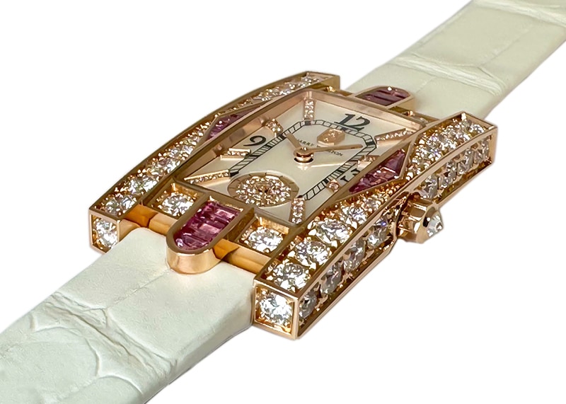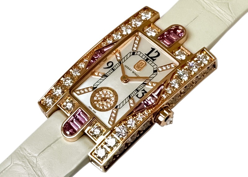 ハリーウィンストンを象徴するアイコンモデル「アヴェニュー」。 2018年にデザインが刷新された特別モデルの「アヴェニュー クラシック オーロラ」が入荷いたしました。 ベゼル正面にはバゲットカットのピンクサファイアを12個/約0.79ctを4方向にセッティング。 ブリリアントカットされたダイヤモンドはケース前面だけではなく側面や文字盤、リューズにも総数99個/約3.47ctをセットした、ハイセンスな女性の腕元を贅沢に彩る美しいモデルです。 また、ジュエリーとしても最上の輝きを放ちながらもしっかりと時刻が見やすいのがこのモデルのポイントです。 商品状態は当店入荷後に機械点検と、外装の傷取り(研磨)、ストラップの新品交換を行っており、とても綺麗な状態です。 付属品は、箱・保証書(2019年1月)がございます。 さらに詳しい内容を確認されたい方は、お気軽にお問い合せ下さい。 管理用:own952