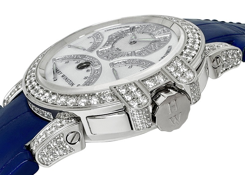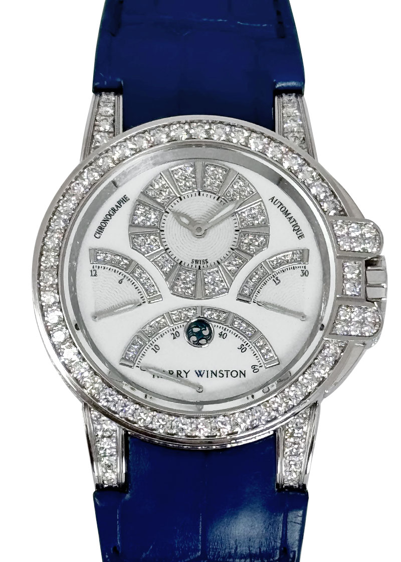 「キング・オブ・ダイヤモンド」の異名を持つハリーウィンストンから 「オーシャン トリレトロ クロノグラフ」が入荷しました。 ジュエリーブランドとして名高いその最高級のダイヤモンドを使用した時計の数々は、その輝きで他とは一線を画します。 中でもこのトリレトロ クロノグラフは、抜群の華やかさと複雑機構を併せ持ち、生産終了となった今でも 非常に人気の高いモデルです。 ハリーウィンストンが独自開発した特殊合金ザリウムを使用するシリーズ“プロジェクトZシリーズ”の第一弾“プロジェクトZ1”がベースで、オフセンターに位置する時分針ダイヤルと、3つのレトログラードダイヤル(クロノ針・積算計)を持ち、特徴的モチーフの手裏剣型が秒を刻みます。 各々のダイヤルはもちろん、大き目44mmのケースにはケースサイド・ラグに至るまでびっしりと最高級ダイヤモンドが敷き詰められ、非常に煌びやかで存在感抜群の1本です。 オーデマピゲ、ブランパンなどにも使用され、高級ムーブメントとして知られるフレデリックピゲ製のコラムホイール式クロノグラフムーブメントを搭載。 ダイヤの総カラット数約6.65ctというラグジュアリー感ながら、100mの防水性能により日常使用に於いても安心です。 オリジナルは尾錠タイプのピンバックルですが、ワンタッチで取り外し可能なDバックル用のクラスプが付帯している点もプラスポイントです。 商品状態として、当店入荷後にオーバーホール・外装仕上げ済み。僅かな小傷は残りますが全体的に綺麗な個体です。 ストラップは多少の使用感はございますが、現状のままご使用いただけます。 付属品は、箱・保証書がございます。 さらに詳しい内容を確認されたい方は、お気軽にお問い合せ下さい。 ※生産終了モデル 参考税込定価 11,605,000円 管理用:owo306