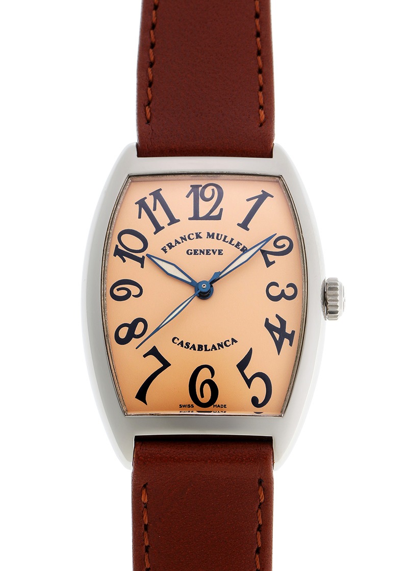 フランクミュラーより「カサブランカ」の初期型が入荷しました。 伝統と革新を重んじながら、独自のスタイルを追求する稀代の天才時計技師フランク・ミュラー。 トノー型のケースは他ブランドとは異なる様々なこだわりが詰まったフランクミュラーの代名詞とも言えるケース形状です。 こちらのモデルは、カサブランカ コレクションが発表された初期型のタイプ。 ビザン数字が現行モデルと比べ直線的で可愛らしい印象があり、 裏蓋の刻印も「CASABLANCA」とのみ刻印されているのが特徴です。 あえてUV加工を施していない文字盤は、アイボリーに近い自然なピンク色となり、 これからもオーナー様と同じように時を重ねる粋な仕様となっています。 ケースはメンズサイズの中では小さめの縦43mm × 横31mm。 自動巻きのムーブメントを搭載し普段使いもしやすく、袖口にもスマートにおさまります。 提携工房にて機械のオーバーホール(分解掃除)、外装の傷取り(研磨)をおこなっています。 尾錠はフランクミュラー純正です。 2001年12月に国内正規販売店にて販売がされた商品で、フランクミュラーの箱と保証書が付属します。 さらに詳しい内容を確認されたい方は、お気軽にお問い合せ下さい。 管理用:owm457