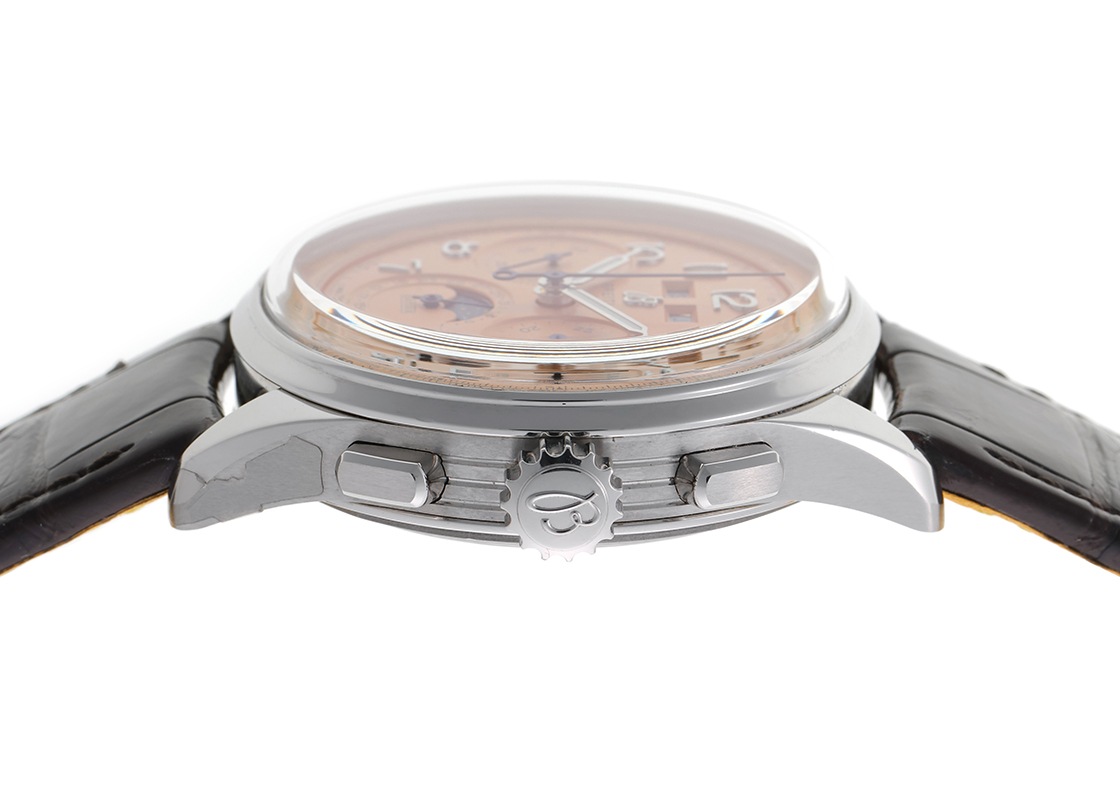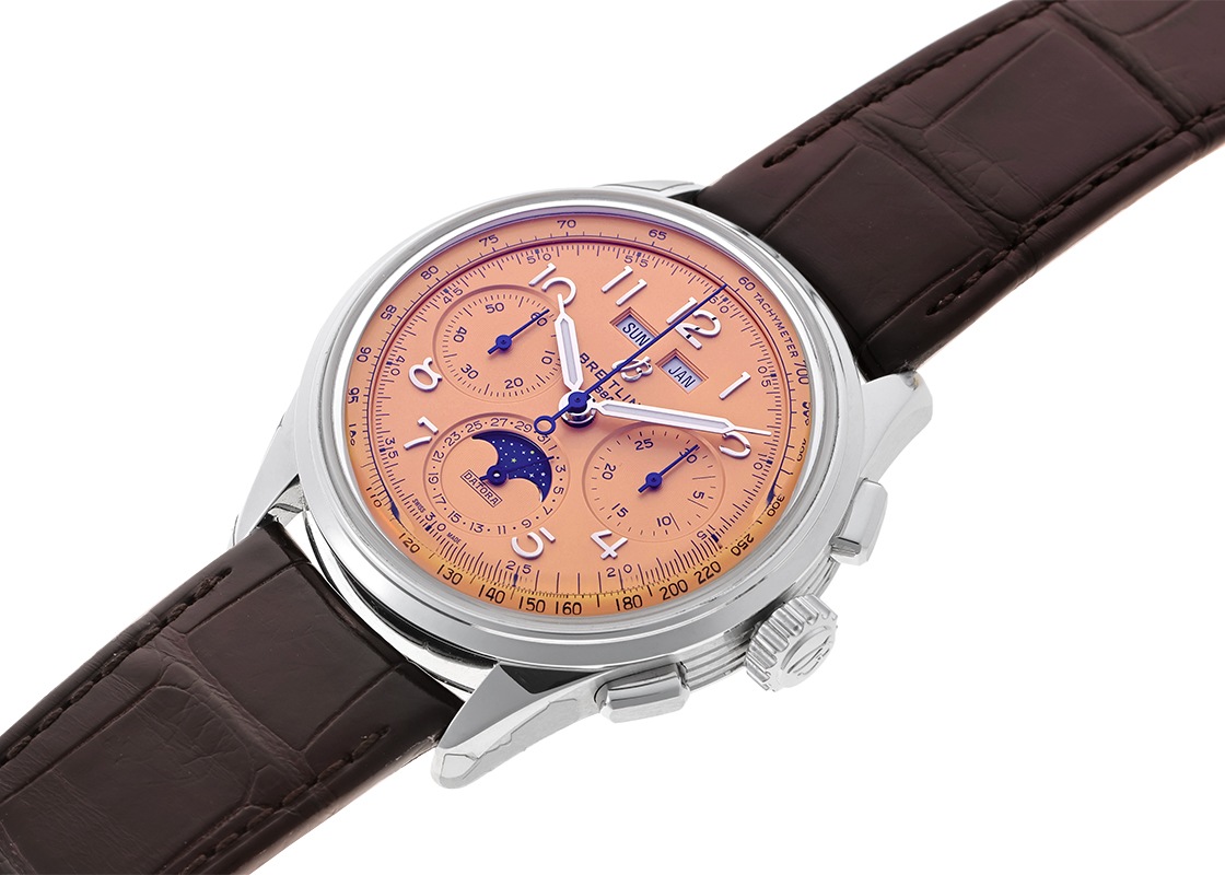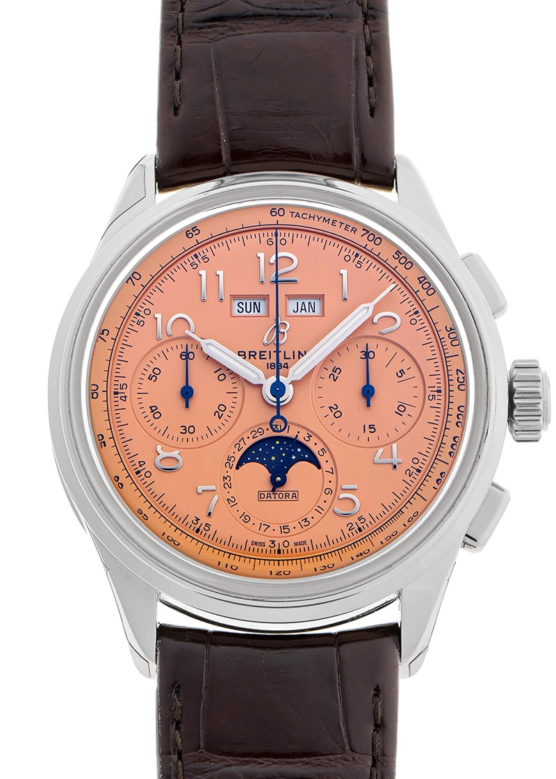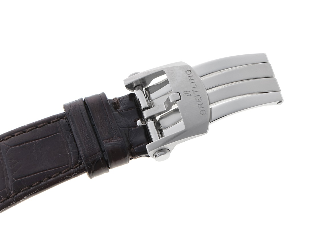ブライトリングの「プレミエ B25 ダトラ 42」が入荷しました。 2021年発売のトリプルカレンダームーンフェイズクロノグラフを備えた複雑機構のモデルです。 「プレミエ」とはフランス語で”最初”という意味があり、1943年に洞察力に富むスタイリッシュな顧客向けに発売されたコレクションに使われていた名前です。 当時、クロノグラフ・デュオグラフ・ダトラの3モデルから構成されていました。 そして「ダトラ」とは、1940年代にブライトリングが使用していた言葉で、曜日、日付、月、そして異なるムーンフェイズを表示するフルカレンダーのクロノグラフのことです。 独語で「日付」を意味する「Datum(ダートム)」に由来しています。 こちらの「プレミエ B25 ダトラ 42」最大の特徴は、クラシックなカッパー色の文字盤です。 カッパー色は銅色を意味し、肌馴染みが良く、落着きと上品さを与え、定番のシルバーやシャンパンより洗練されたイメージを与えてくれます。 また、ヴィンテージウォッチによく見られるシリンジ(注射器)型の時分針は視認性を、長方形のクロノグラフプッシャーは操作性を考えられたデザインです。 ムーブメントは、自動巻き式のCOSC認証を受けたブライトリング製キャリバーB25、パワーリザーブは48時間、防水性能は10気圧です。 提携工房にて外装の傷取り(研磨)をおこなっています。 ストラップは使用感が若干みられますが、まだまだ十分にお使いいただける状態です。 ブライトリングの箱、保証書が付属します。 ブライトリングの保証が2028年7月まで有効です。 さらに詳しい内容を確認されたい方は、お気軽にお問い合せください。 管理用:owp291