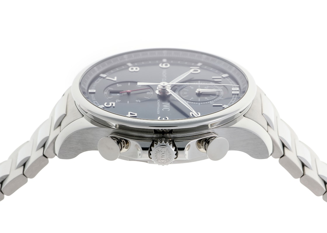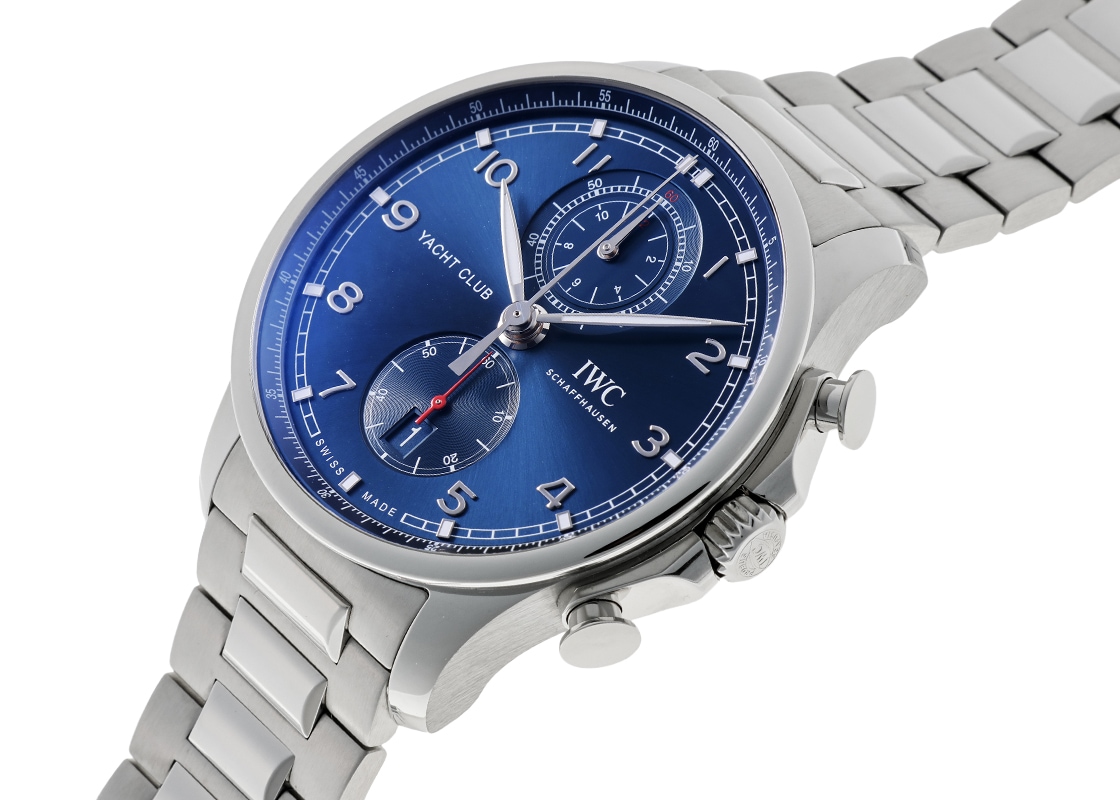 IWCより「ポルトギーゼ ヨットクラブ クロノグラフ」が入荷しました。 現在のIWCにおいて、絶大な人気を誇り、ブランドのアイコンとなっている「ポルトギーゼ」。 一方、ヴィンテージウォッチというジャンルで近年その価値が注目されつつある「ヨットクラブ」。 特に1967年に登場したヨットクラブの初作「1811」は、パテックフィリップのノーチラス、オーデマピゲのロイヤルオーク等をデザインし、時計のデザインに自由度を与えたことで有名なジェラルドジェンタ氏をデザイナーに起用しています。 機能面においても防水性を確保するためにスクリューバックを採用しました。 この二つの偉大なモデルネームを受け継ぐ、「ポルトギーゼ ヨットクラブ クロノグラフ」はどのような時計なのでしょうか。 デザインは、完成された「ポルトギーゼ クロノグラフ」をベースに、スポーティかつエレガントに昇華しています。 裏蓋の構造もネジ留めからスクリューバックを採用。 リューズはリューズガードの付いたねじ込み式リューズへと変更され、操作性、安全性も向上。 そして防水性は3気圧から10気圧防水となりました。 外見上の類似性こそほぼないものの、実用性は「ヨットクラブ」の名を継ぐにふさわしいものとなっております。 また、文字盤にはポルトギーゼの特徴であるアラビア数字のアプライトインデックスを使用しつつ、針と分メモリインデックスに夜光を用い、夜の船上でも活躍しうる視認性を確保しています。 9時に配置された「YACHT CLUB」のロゴもからも、現在と過去が一つとなった、IWCの強い思いが伝わるモデルとなっております。 ケース径は44.6mm、厚みは14.3mmのステンレススティール製です。 搭載されるのはフライバック機能を備えた自動巻IWC自社製キャリバー89361、パワーリザーブは約68時間です。 ブレスレットは腕周りが約20cmの方まで対応します。 さらに詳しい内容を確認されたい方は、お気軽にお問い合せください。 管理用:owp661