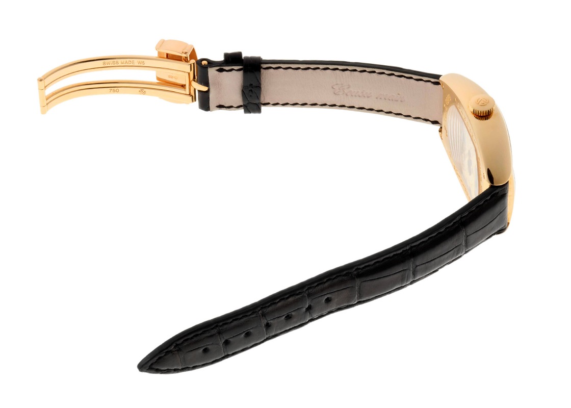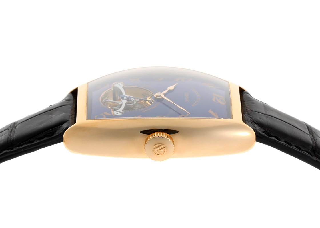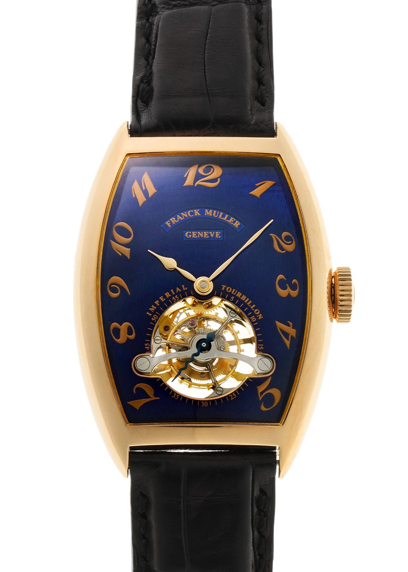 フランクミュラーより、ブランド創成期の「インペリアル トゥールビヨン」が入荷いたしました。 三大複雑機構の1つであるトゥールビヨンが搭載されており、姿勢差による重力の影響を均一化することで精度を安定させています。 インペリアルトゥールビヨンは1995年発表。 複雑かつデリケートな構造上、よく故障するトゥールビヨンを不吉であると嫌った貴族の逸話を元に制作された時計です。 このモデルは高い技術によって故障が少ないトゥールビヨンを実現し、回転するキャリッジ(籠)を3つの鋭利な剣の形にデザインすることで不吉と言われた邪気を払う役割を果たしています。 キャリッジには時計の心臓部であるテンプが納められており、転じて人の生命を災いから守る「魔除け」や「お守り」としての意味も込められています。 ムーブメントは手彫りによるエングレイビングが施されています。 シースルーバックからはそのエレガンスな彫刻や、巻き上げるたびに柔らかい音を奏でるムーブメントの様子を眺めることができます。 文字盤は、目を奪われるほど美しいブルーエナメルです。 かごの網目のような繊細なギョーシェパターンに、ガラス質の釉薬(ゆうやく)を塗っては焼き、繰り返し重ねて作られています。 光の反射により、ブルーにもパープルにも見える高貴な輝きは、ピンクゴールドのアップライトインデックスと相まって、時を忘れて眺め続けてしまうほどです。 商品状態は、内部点検と外装仕上げを施しており、抜群のコンディションです。 レザーストラップは新品に交換済み、フランクミュラー純正のDバックル仕様です。 時計本体のみで付属品がございませんので、クロンヌオリジナルBOXをご用意いたします。 さらに詳しい内容を確認されたい方はお気軽にお問い合せ下さい。 管理用:ii-602
