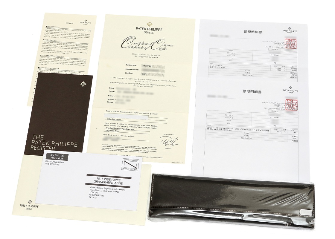 2006年に国内の正規店で販売がされた商品で、パテックフィリップの保証書(購入者記載欄の切り抜きあり)、修理明細書(2025年4月)、サービスケースが付属します。
