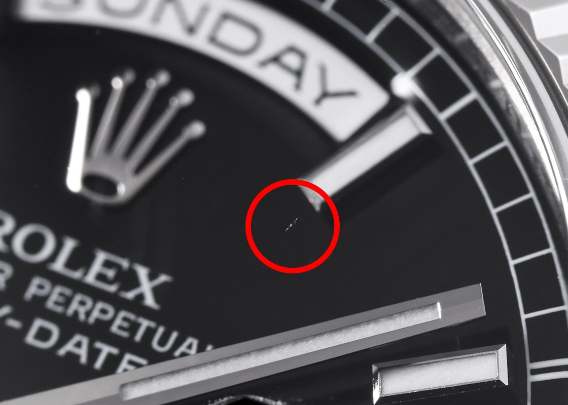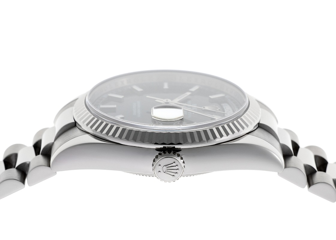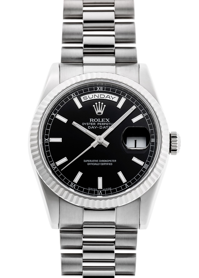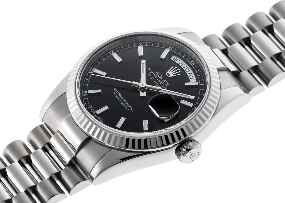 ロレックスの「オイスターパーペチュアル デイデイト」が入荷しました。 1956年に発表されたデイデイトは、ロレックスの中で最上級のモデルです。 「日付と曜日は不可欠である」と創業者 ハンス・ウィルスドルフが述べたように、3時位置の日付に加えて12時位置のフルスペルの曜日を2つの小窓にそれぞれ表示し、同時に切り替わる世界初の腕時計として登場しました。 ゴールドまたはプラチナの貴金属のみで製造される特別なコレクションとして、半円形のリンクが3列で形成された専用ブレスレット「プレジデントブレスレット」を採用しています。 しなやかでゴールドならではの重厚感をお楽しみいただけます。 このたび入荷したデイデイトは「118239」。 旧型と比較して全体に丸みを帯びており、ラグやブレスレットの側面がポリッシュ加工へと変わり、より煌びやかになりました。 ムーブメントはデイデイト専用のキャリバー 3155を搭載し、パワーリザーブは48時間です。 入荷時の文字盤はシルバー色・ダイヤモンドインデックスのタイプで、日本ロレックスにて黒文字盤へ交換をしています。 オーバーホール(機械の分解掃除)と外装の傷取り(研磨)、文字盤交換に加えて針とリューズも交換を実施しています。 たいへん綺麗な状態で、ブレスレットも経年変化もみられません。 ガラスの表面に一箇所傷がみられますが、視認性に問題はございません。 ロレックスの修理保証が2年間有効で、より安心をしてお使いいただけます。 時計の個体番号はZ番から始まり2010年に販売がされた商品です。 ロレックスの箱、保証書、タグ、修理明細書、交換前に取り付けてあった文字盤(シルバー、ダイヤモンドインデックス)が付属します。 ブレスレットは腕回りが約18.5cmの方まで対応可能です。 さらに詳しい内容を確認されたい方は、お気軽にお問い合せください。 管理用:owp824