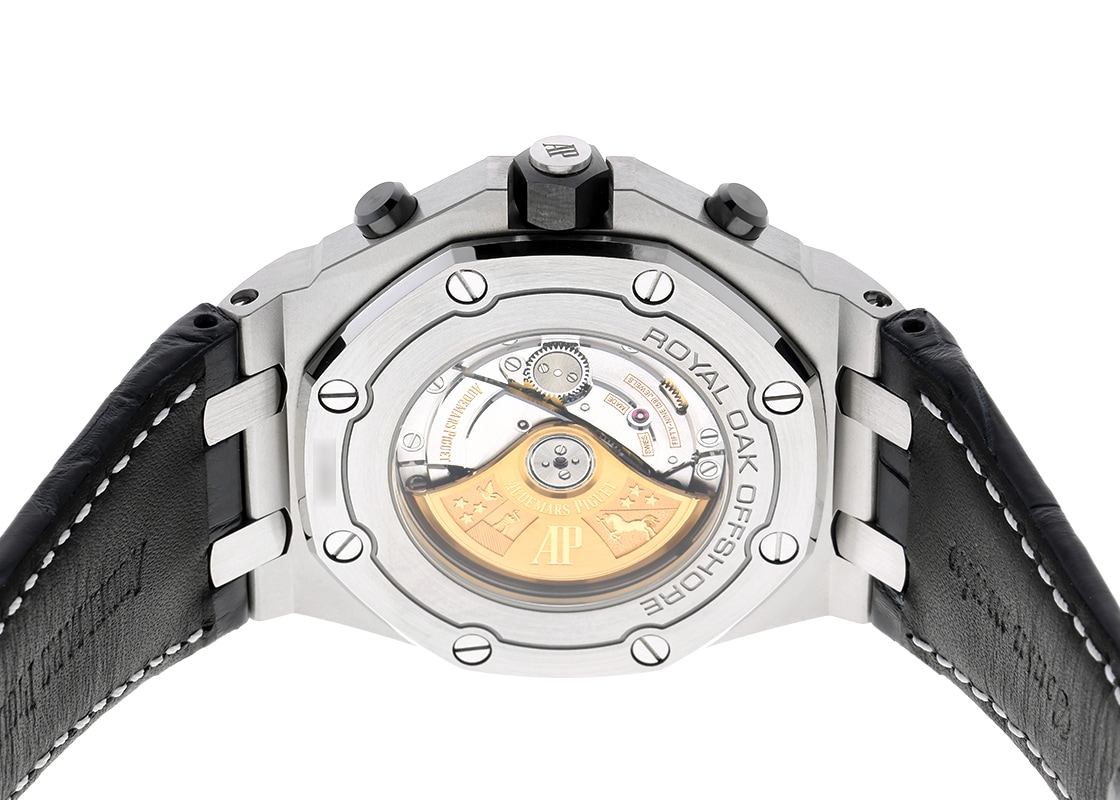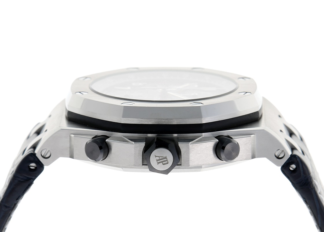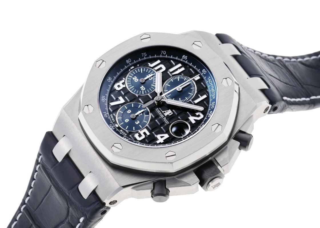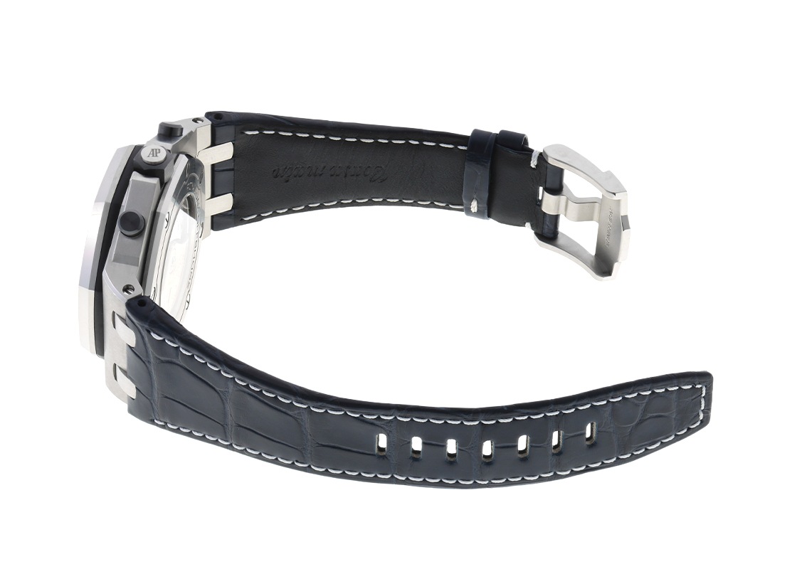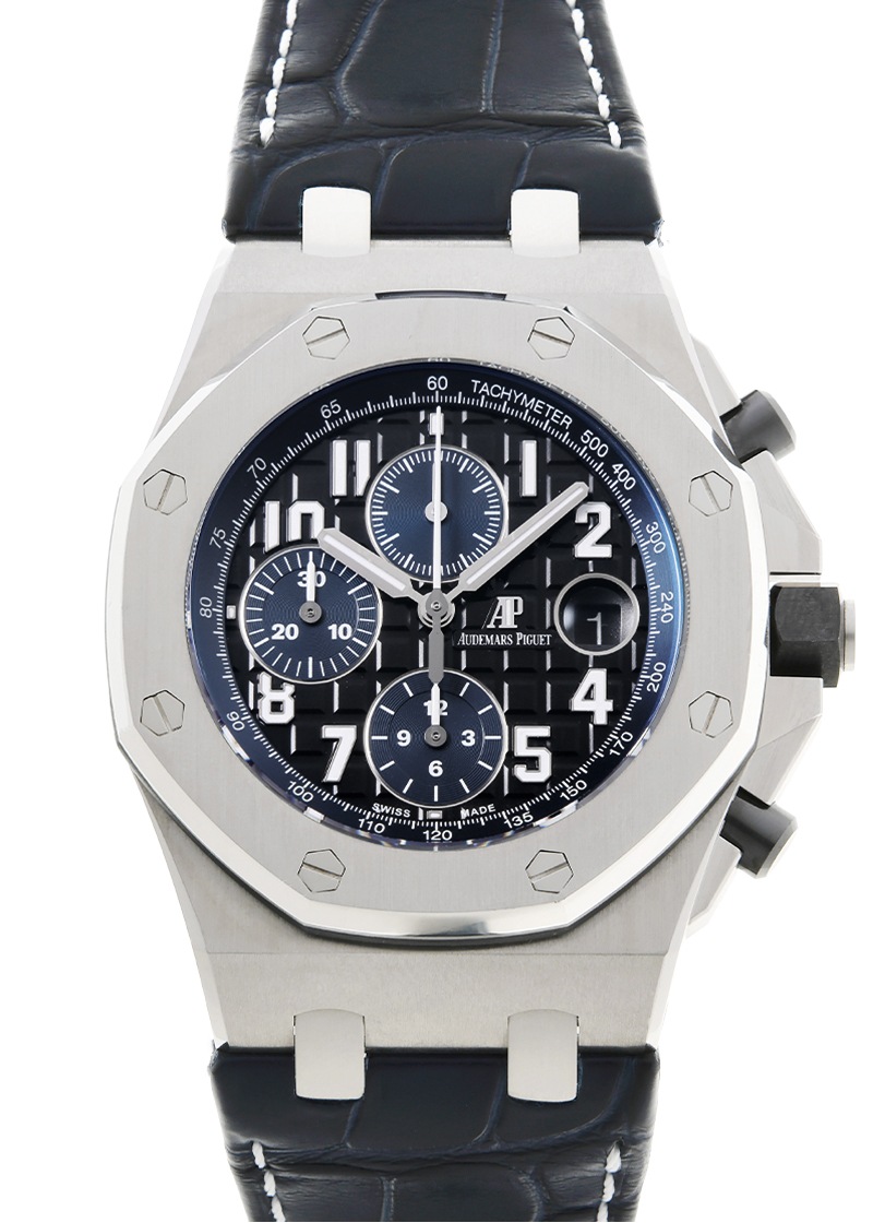 オーデマピゲより、「ロイヤルオーク オフショア クロノグラフ」が入荷しました。 世界三大時計ブランドのひとつ、オーデマピゲを代表するモデルと言えば「ロイヤルオーク」です。 「ロイヤルオーク」シリーズは1972年の誕生以来、常に時代の最先端を牽引してきました。 そして20周年を記念して、1993年にラグジュアリーな要素を持ちつつ、スポーティなエッセンスを加えることで誕生したのが「ロイヤルオーク オフショア」です。 現在でもオーデマピゲを代表するコレクションとなっています。 8角形ベゼルを持つ42mmのケースにクロノグラフとタキメーターを搭載し、文字盤には「ロイヤルオーク」で確立されたタペストリーをサイズアップした、メガ・タペストリーが施されているのが特徴です。 こちらは、品のあるブラックの「メガ・タペストリー」模様と深いブルーのカウンターとインナーベゼルのカラーコンビネーション。 ケースはステンレススティール製でリューズ・プッシュボタンはセラミック製で耐食性に優れ、操作性が抜群です。 シースルーバックからは、自社製キャリバー3126/3840の美しい動きをご覧いただけます。 デイト表示、クロノグラフ、スモールセコンド搭載モデルでパワーリザーブは50時間です。 提携工房にてオーバーホール(分解掃除)と外装の傷取り(研磨)をおこなっています。 ベゼルの一部に僅かに取り切れない傷がございますが、視認性などに問題は無い程度です。 ストラップはオーデマピゲ純正の中古のクロコダイルベルトを取り付けており、 若干の使用感はございますが、状態は良好でまだまだお使いいただけます。 オーデマピゲの箱と保証書が付属します。 週末のドライブやリゾート、特別な日のスタイルにも映える存在感で、腕元に確かなステータスを与えてくれるでしょう。 さらに詳しい内容を確認されたい方は、お気軽にお問い合せください。 管理用:owp859
