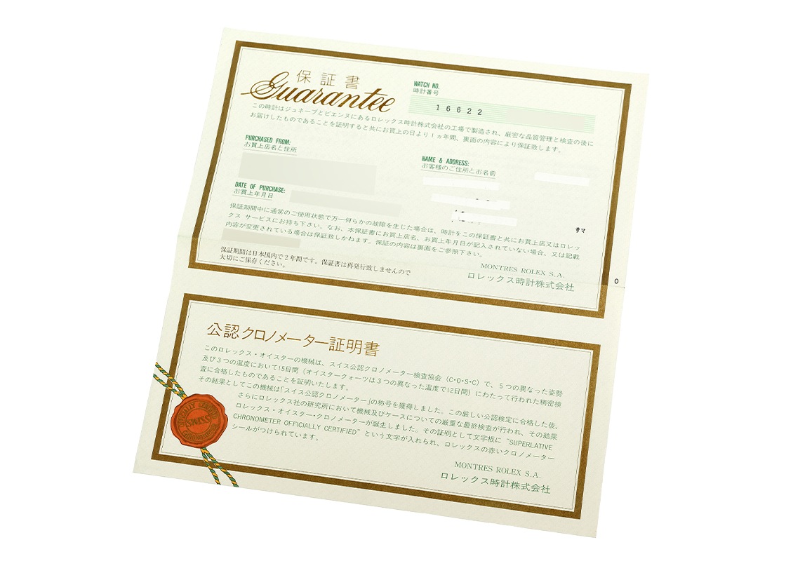 国内の正規店にて2000年6月に販売がされた商品で、ロレックスの保証書、当店オリジナルの携帯ケースが付属します。