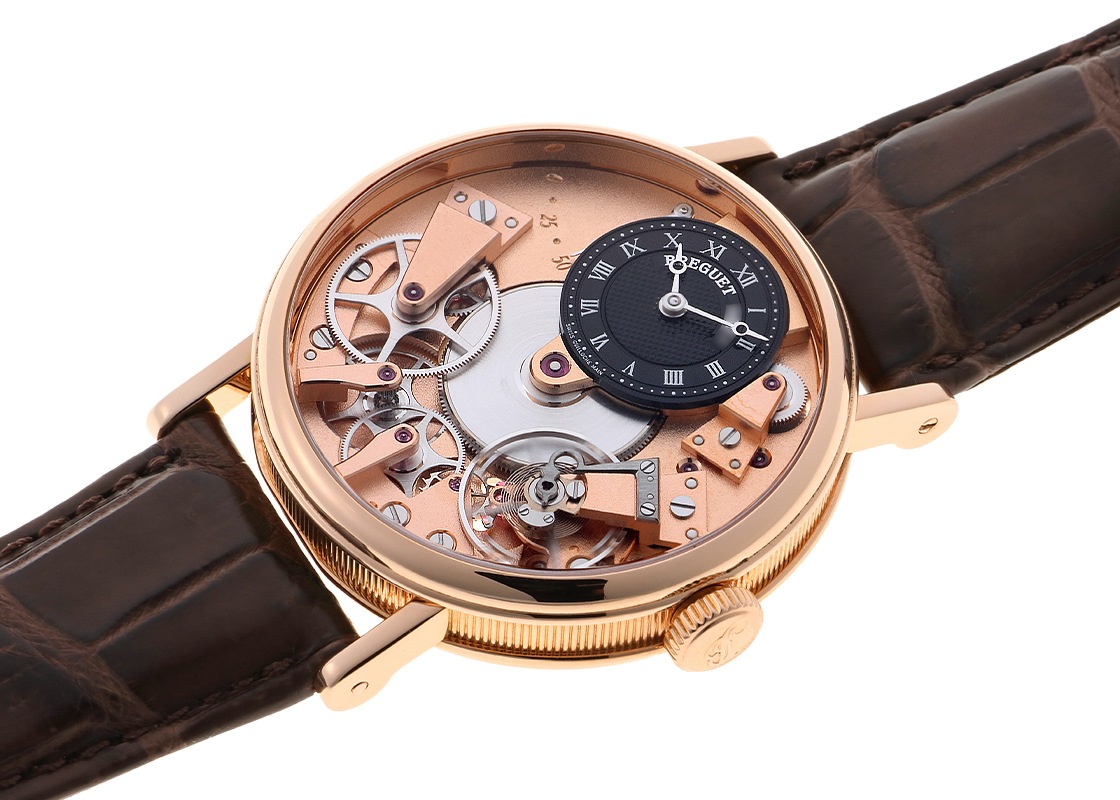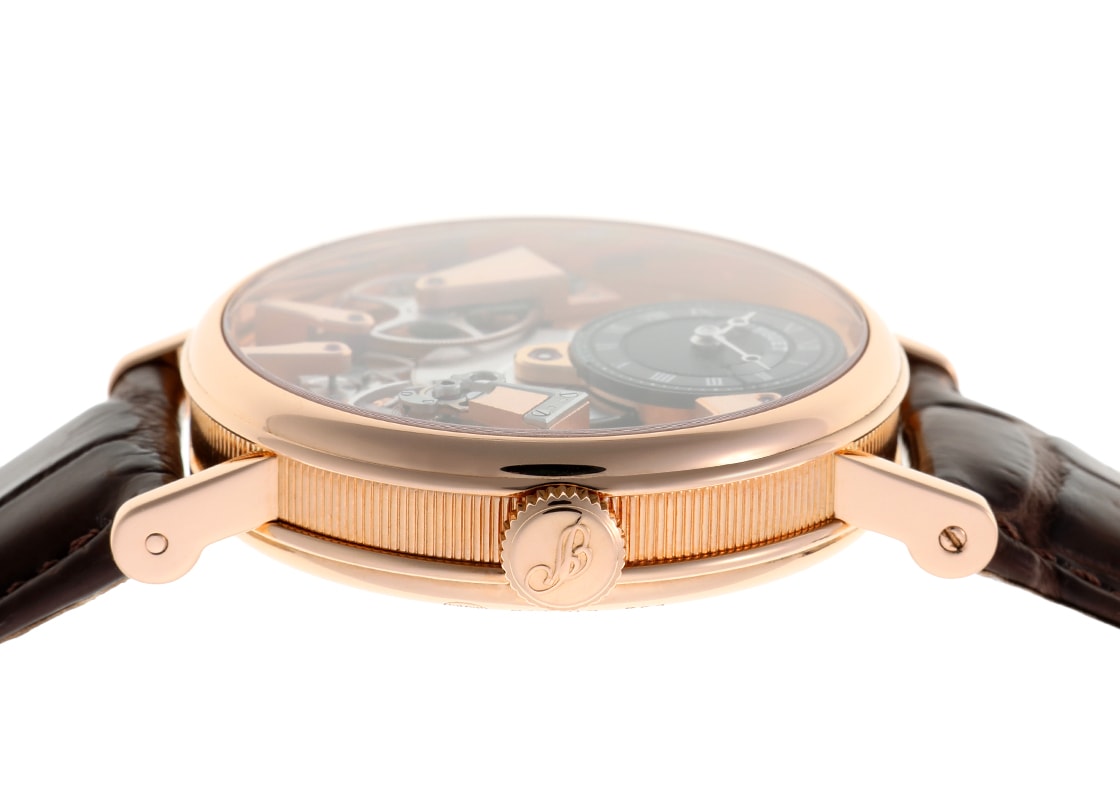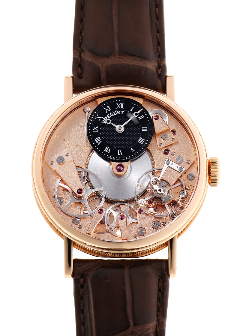 ブレゲの「トラディション7027」が入荷しました。 1794年にブレゲが発明した耐衝撃機構(通称パラシュート)、可変慣性テンプを搭載し、過去の懐中時計を再現したモデルです。 非対称の文字盤が特徴で、中央部分には香箱、両面にはパワーリザーブインジケーター、6時側に輪列機構と脱進機が配置され、天才時計師ブレゲが発明した機構が思う存分観賞できるレイアウトが魅力です。 細部まで手作業で仕上げられたその美しさは、ケースバックからも感じることができます。 ケースサイドにはコインエッジが施され、ブレゲらしいクラシカルな雰囲気も感じられる逸品です。 ムーブメントは手巻式キャリバー507DRを搭載し、パワーリザーブは約50時間を誇ります。 2025年3月にブレゲにてコンプリートサービス(分解掃除)、ケース修理、メインプレートの交換を行っています。 ストラップは当店オリジナルのクロコダイルベルトを取付けています。 ブレゲの修理明細書、当店オリジナルの携帯ケースが付属します。 さらに詳しい内容を確認されたい方は、お気軽にお問い合わせください。 管理用:owp929