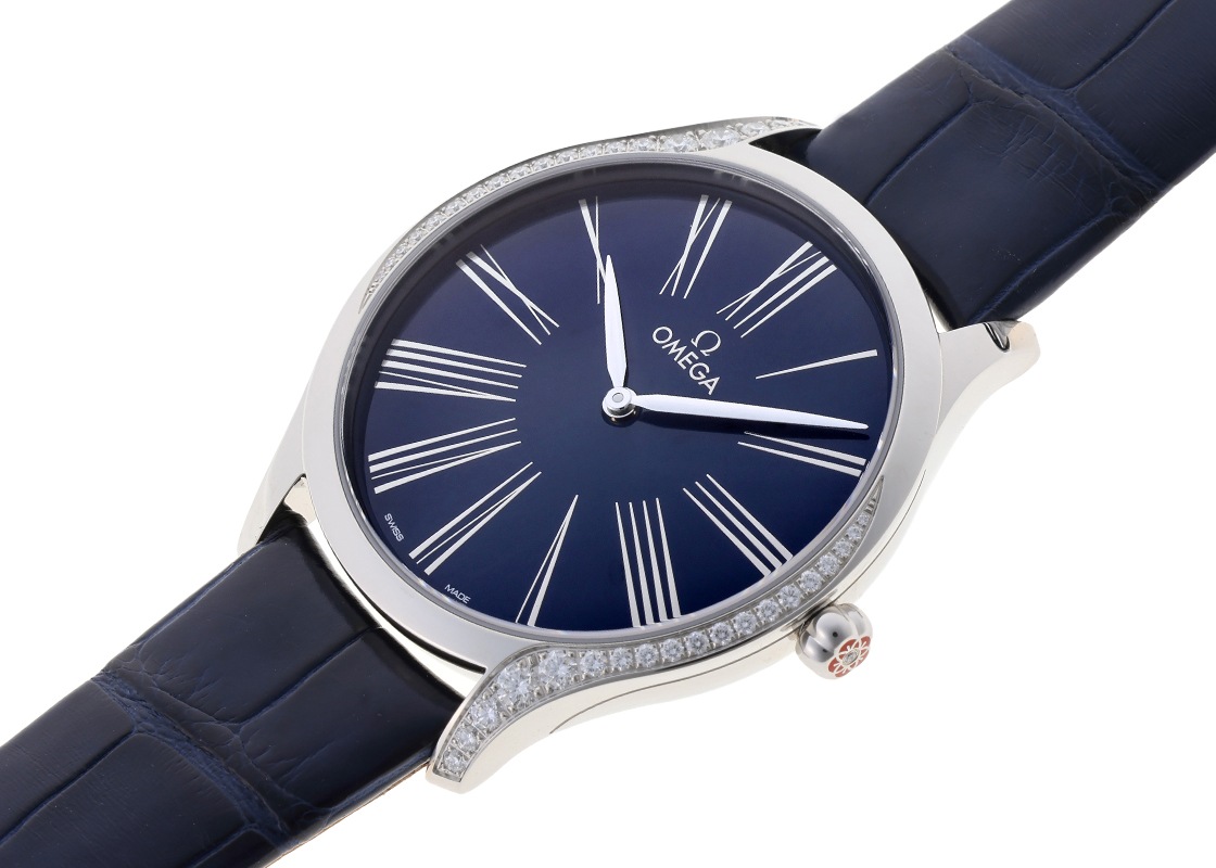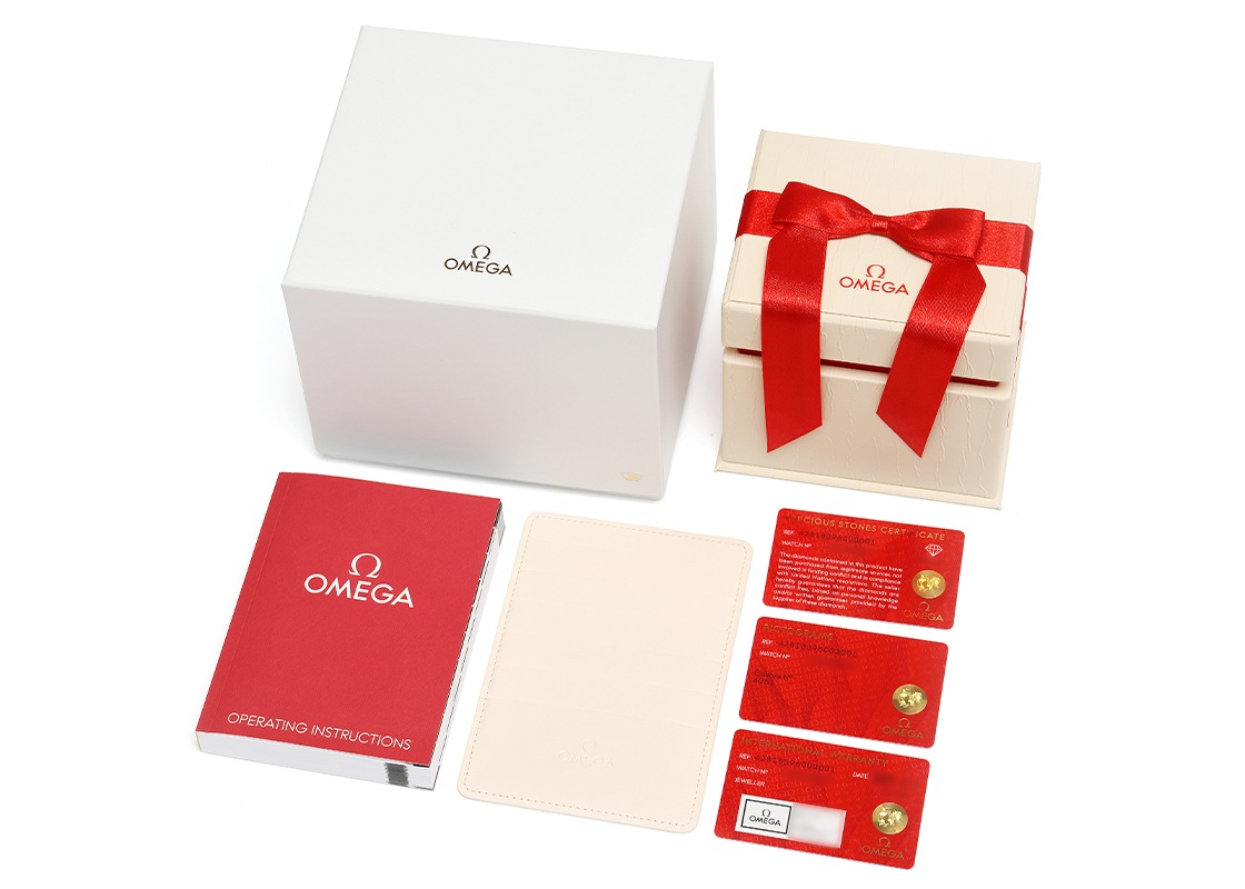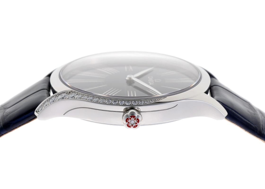 リューズには、赤色のハイセラム(セラミックの一種)が使用され、オメガマークを5つ重ねたフラワーモチーフの中心には一粒のダイヤモンドが輝きます。