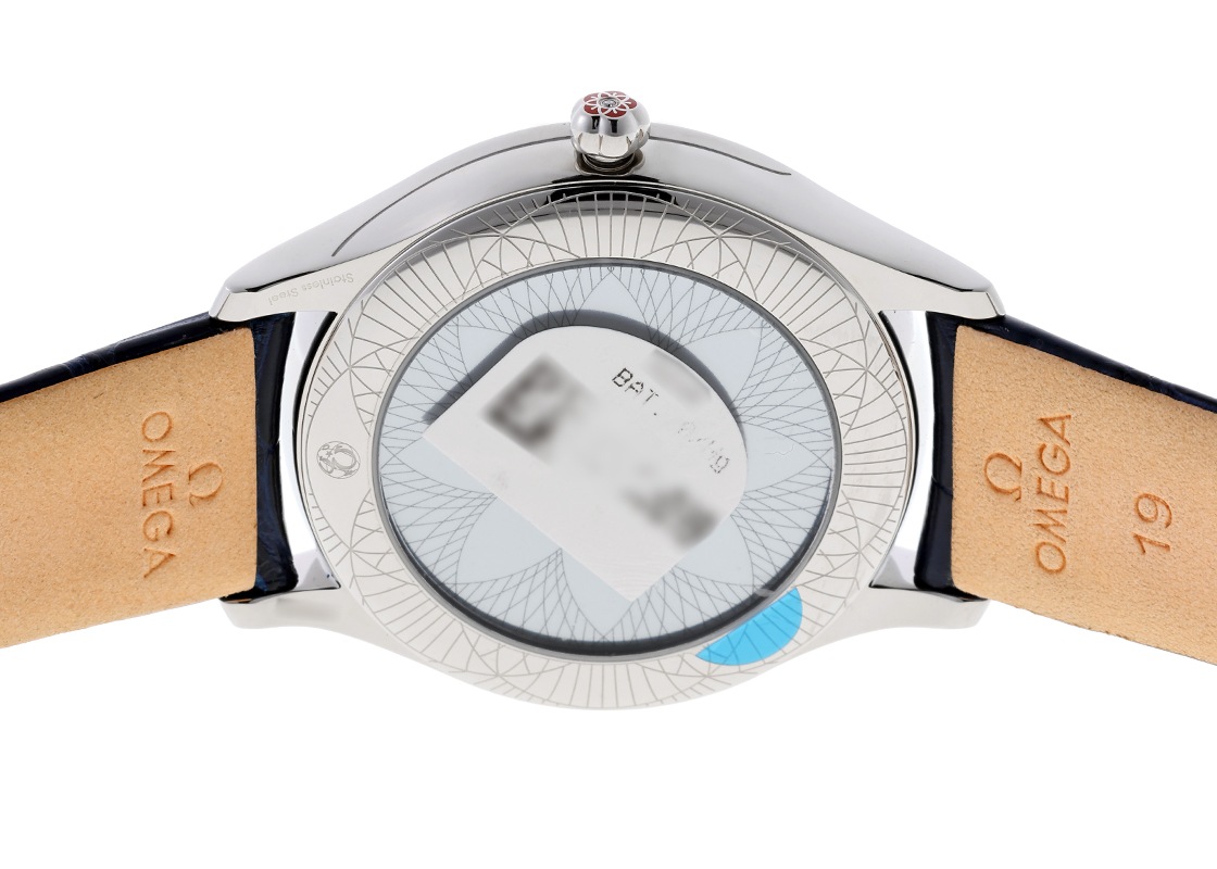 裏蓋には、オメガが「誰にとっても大切な時間」をテーマに開催した展覧会のシンボルである「Her Time」パターンが描かれます。