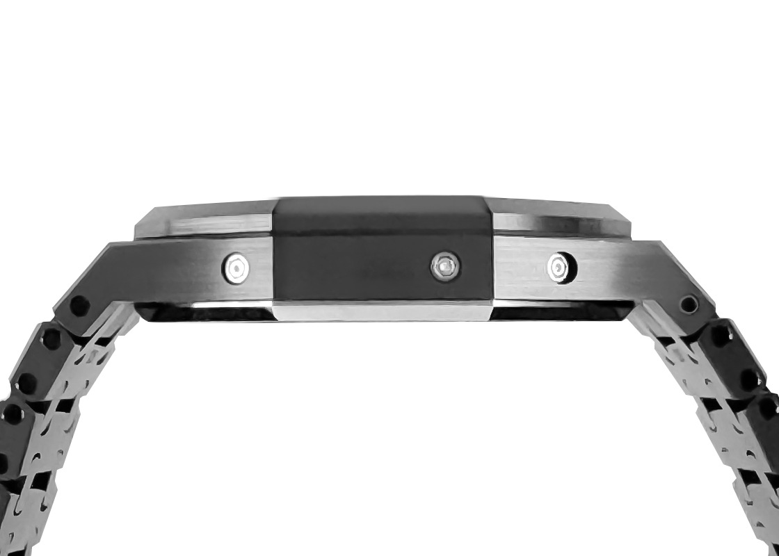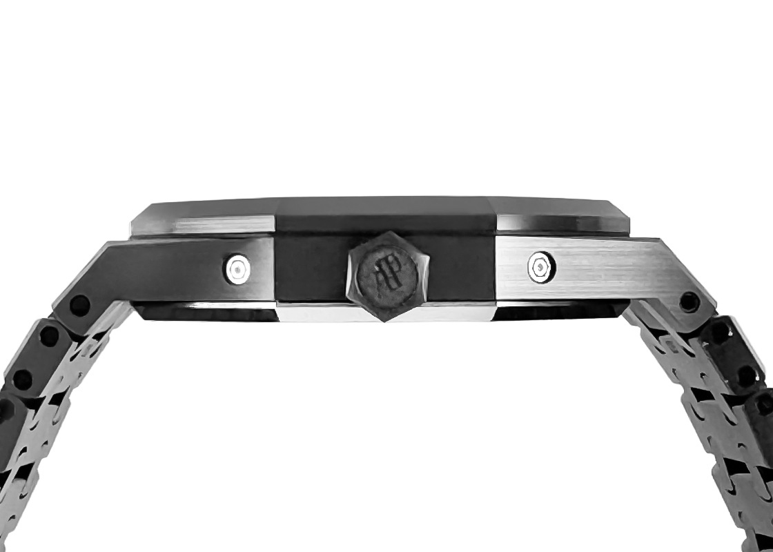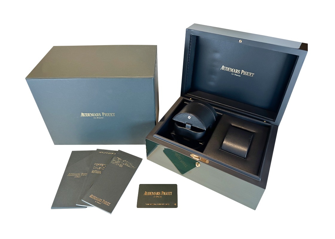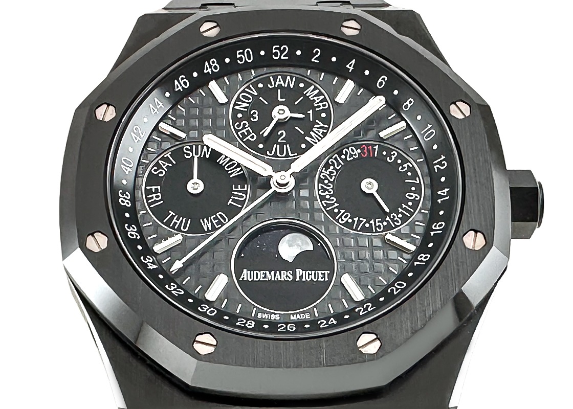 オーデマ・ピゲより「ロイヤルオーク パーペチュアルカレンダー」が入荷しました。 複雑機構開発に於いて高度な技術力に定評があるオーデマピゲが、1955年に世界で初めて閏年に対応した永久カレンダーを腕時計に搭載しました。 2015年にはフラッグシップモデルとなるロイヤルオークにコレクションされ、2017年には初のブラックセラミックをケース素材にして発表されました。 硬質で加工が難しいセラミックにサテンブラッシュとポリッシュを組み合わせた高度な外装仕上げが施され、ベゼルとミドルケース、ブレスレットにはエッジの効いたデザインが存在感を際立たせています。 グランドタペストリー装飾が施されたスレートグレーダイヤルには、閏年と月・日付け・曜日を表示するインダイアルと、アベンチュリンで夜空に煌めく星と天然石にリアルな月面を転写した精巧で美しいムーンフェイズが6時に配しています。 また、センターから伸びた白い矢印型の針が1年間の週数を表示しており、同社のパーペチュアルカレンダーの特徴とも言えます。 搭載されたオーデマピゲが誇る超薄型ムーブメントCal.5134は、パワリザーブ40時間。 地板と受けには美しい装飾、ゴールド製ローターは透かし彫りされており、スケルトンバックからその美しさを楽しむことができます。 商品状態は、セラミック素材につき傷のない綺麗な個体です。 ブレスレットはフル駒で、付属品として箱・保証書(2018年11月)がございます。 さらに詳しい内容を確認されたい方は、お気軽にお問い合せ下さい。 管理用:ii-629