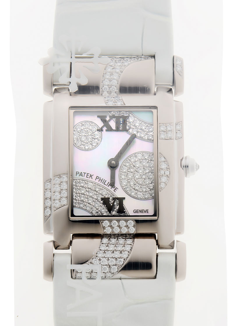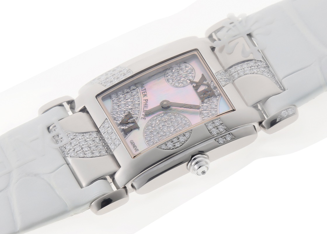 名門マニュファクチュールのパテックフィリップより、レディスライン「Twenty-4 ダイヤモンド」が入荷しました。 誰もが憧れる雲上ブランドパテックフィリップが、1999年、“女性のために”デザインし発表したモデルがTwenty-4です。 昼も夜もアクティブな現代女性に、24時間寄添う時計としてこの名が付けられました。 こちらは、ケースと文字盤を跨ぐようにサークル状に配されたダイヤモンドが最大の特徴です。 ホワイトゴールド製のケースや、文字盤のマザーオブパール、植字のローマ数字など、大変エレガントな仕様となっております。 女性の手首にぴったりとフィットするカーブしたケース、可動式のラグから隙間なく繋がるストラップは女性の腕を美しく彩ります。 その計算された形状は、エレガントなイブニングドレスやジュエリーにも適するようデザインされています。 パテックフィリップジャパンにてコンプリートサービス(分解掃除)をおこなっています。 ストラップもパテックフィリップへ注文済みですが、後日の入荷予定(目安で12月以降)です。 ベルト交換は時計をお預かりをしてパテックフィリップでの作業となります。 現在付属のストラップはパテックフィリップ純正のクロコダイルベルトで若干の使用感がみられますが、まだまだご使用ができる状態です パテックフィリップの修理明細書、パテックフィリップの携帯ケースが付属します。 2027年8月まで修理保証がございますので安心してお使いいただける上に、メンテナンス後完全な未開封状態ですので、真空パックを開封するところから 新オーナーとしての体験をスタートしていただけます。 是非お手に取ってご覧いただきたい商品です。 さらに詳しい内容を確認されたい方は、お気軽にお問い合せください。 管理用:owp997
