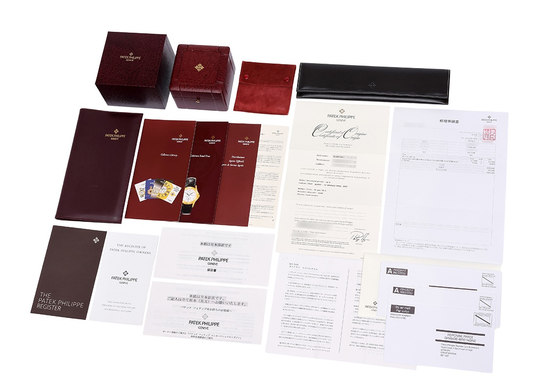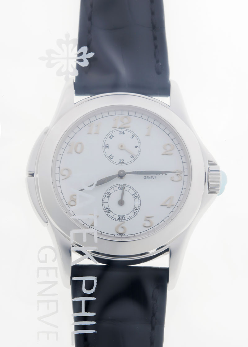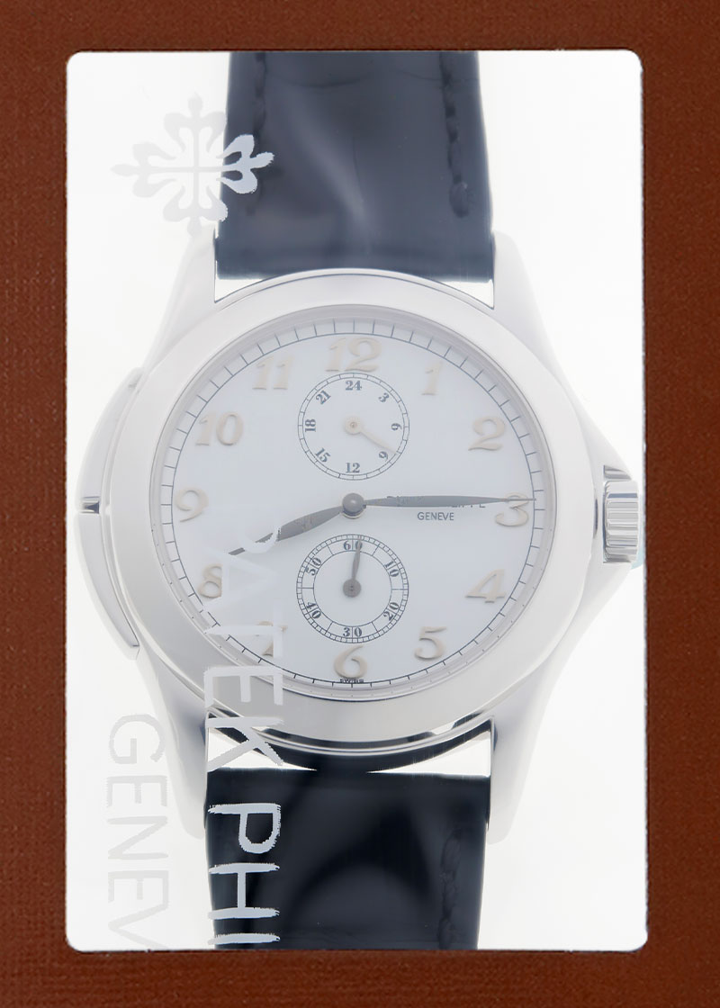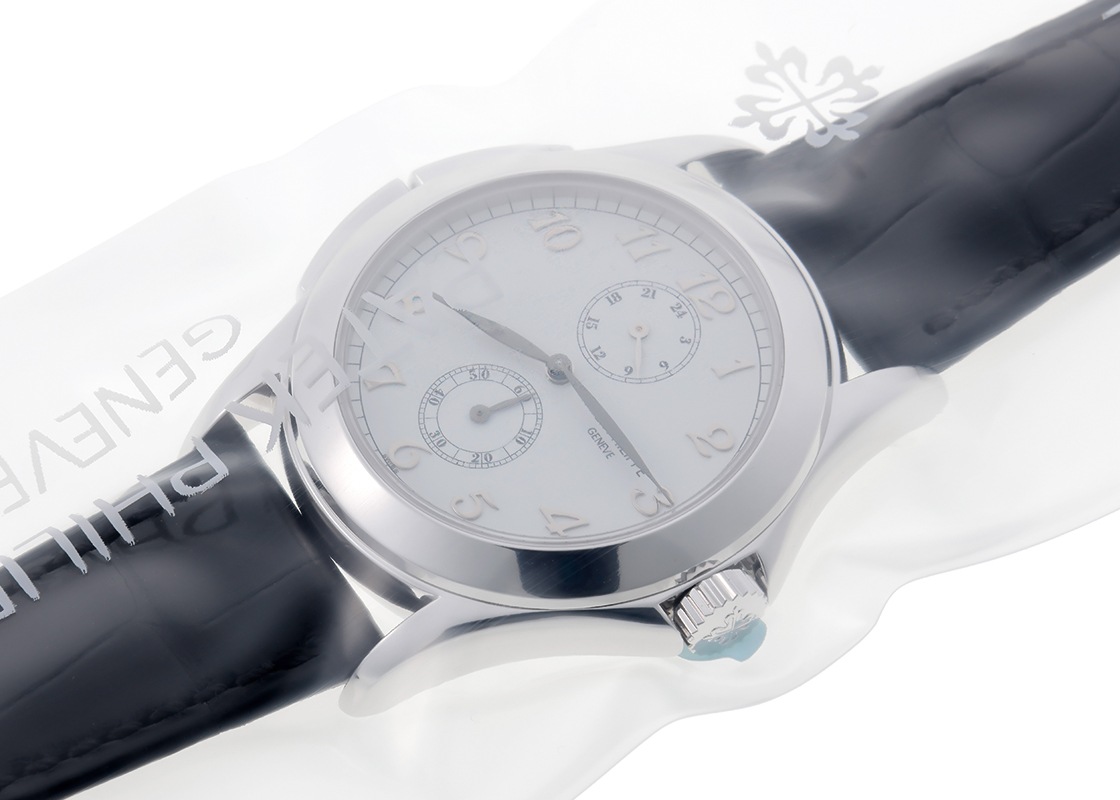 パテックフィリップの5134G-001 カラトラバ トラベルタイムが入荷しました。 高い機能性、操作性がある独創的なタイムピースです。 クラシックなフォルムにカラトラバ特有の美しいアップライトインデックスを配し、異なる2つのタイムゾーンの時刻を同時に表示できるトラベルタイム機能を備えたモデル。 第2時間帯の設定は、9時側にあるプッシュボタンを操作することで簡単におこなえます。 短針を1時間ずつ進めることも戻すこともできます。 文字盤はシンプルなホワイトカラーで、繊細なリーフ針や煌めくアップライトインデックスが美しく映えクラシカルな印象に。 スケルトンの裏蓋から覗くムーブメントにはキャリバー「215PS FUS 24H」を搭載、パワーリザーブは約44時間です。 先代機の5034と比べるとプッシュボタンはケースと一体感のある形になり、袖元から覗くシルエットもスマートに演出します。 商品状態は、提携工房にて外観の傷取り(研磨)をおこなったのち、パテックフィリップでコンプリートサービス(分解掃除)とレザーストラップの交換をしています。 最高の状態でお客様へお渡しするため、メンテナンス後は未開封の状態となっております。 新しく生まれ変わった特別な時計を手にできるのはご購入された方のみ。 パテックフィリップ社でメンテナンスをすることで、「他には無い高品質のタイムピース」が出来上がり、初めて手にされる方も安心してお使い頂けます。 世界最高峰ブランドの「メンテナンス後ファーストオーナー」になってみてはいかがでしょうか。 国内の正規店で2003年9月に販売がされた商品で、パテックフィリップの箱、保証書、パテックフィリップジャパンの修理明細書、携帯ケースが付属します。 修理保証が2027年11月までございますのでより安心してご使用いただけます。 さらに詳しい内容を確認されたい方は、お気軽にお問い合せ下さい。 管理用:owp998