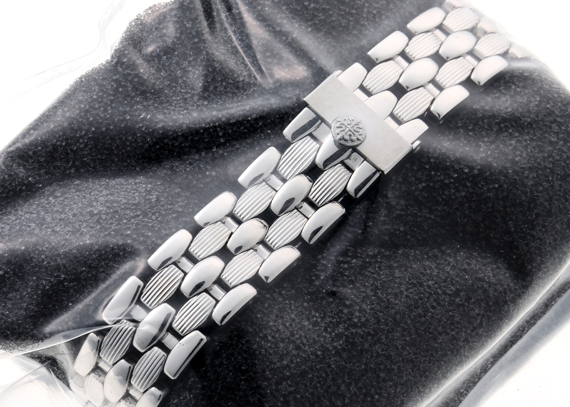 バックルに向かって絞り込まれた細やかな形状のブレスレットには装飾が施されており、ドレスウォッチの色合いも残しています。