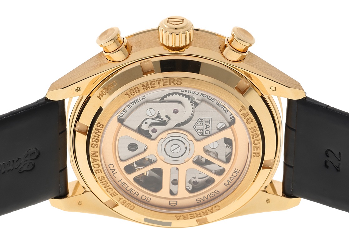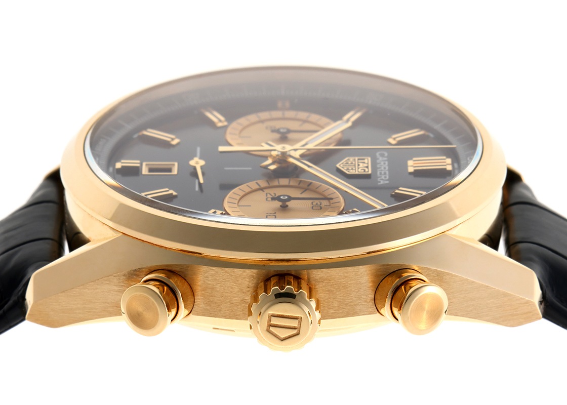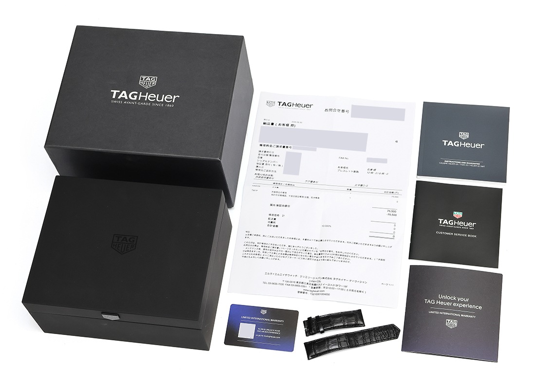 タグ・ホイヤーより、「カレラ キャリバー ホイヤー02 クロノグラフ スペシャルエディション」が入荷しました。 1963年に誕生したカレラは、1950年代の伝説的な公道レース「ラ・カレラ・パンアメリカーナ・メキシコ」に由来し、モータースポーツスピリットを体現するシリーズです。 こちらは2022年に登場した、初のイエローゴールド製モデル“Ref.1158 CHN”の文字盤カラーを反転させた、世界限定600本の特別モデルです。 スポーティさとエレガンスを兼ね備えた配色が魅力です。 42mmのケースは存在感のあるサイズながら、短めに設計されたラグと抑えられた厚みにより、驚くほど快適な装着感を実現しています。 文字盤には横並びのインダイヤルを配置し、3時位置と9時位置には波紋状の装飾「アジュラージュ」が施されています。 ムーブメントには自社製「キャリバー ホイヤー02」を搭載しています。 キャリバー1887をベースに、両方向巻き上げ機構へ改良され、垂直クラッチとコラムホイールによる正確で滑らかなクロノグラフ操作を実現しています。 さらに、約80時間のパワーリザーブを備え、実用性にも優れています。 裏蓋はシースルーバック仕様で、美しく仕上げられたムーブメントをご覧いただけます。 提携工房にて外装の傷取り(研磨)を行っており綺麗な状態です。 タグ・ホイヤーにて点検および文字盤交換(保証期間内)を行っております。 タグホイヤーの箱と保証書(2024年1月販売)が付属します。 ストラップは新品のカシス製アリゲーターベルトを取付けており、気持ちよくお使いいただけます。 若干の使用感はございますが、別途タグホイヤー純正のクロコダイルベルトもお付けいたします。 さらに詳しい内容を確認されたい方は、お気軽にお問い合せください。 管理用:owq098