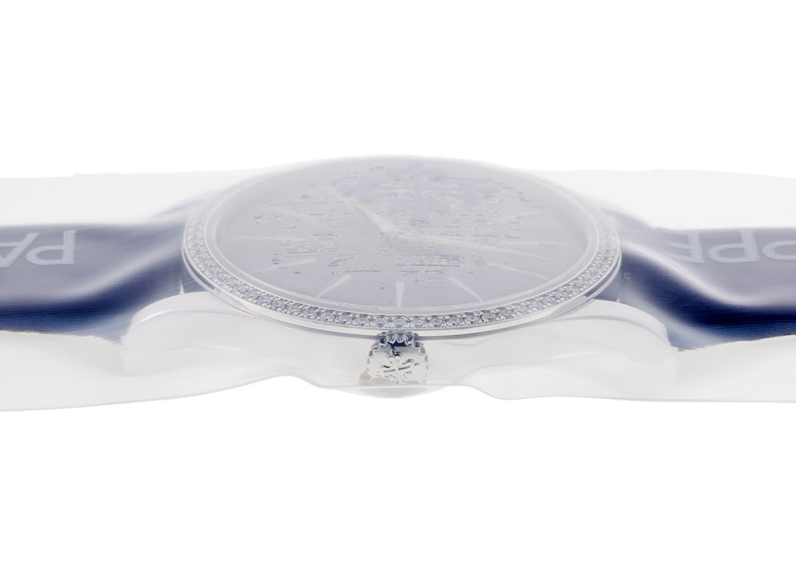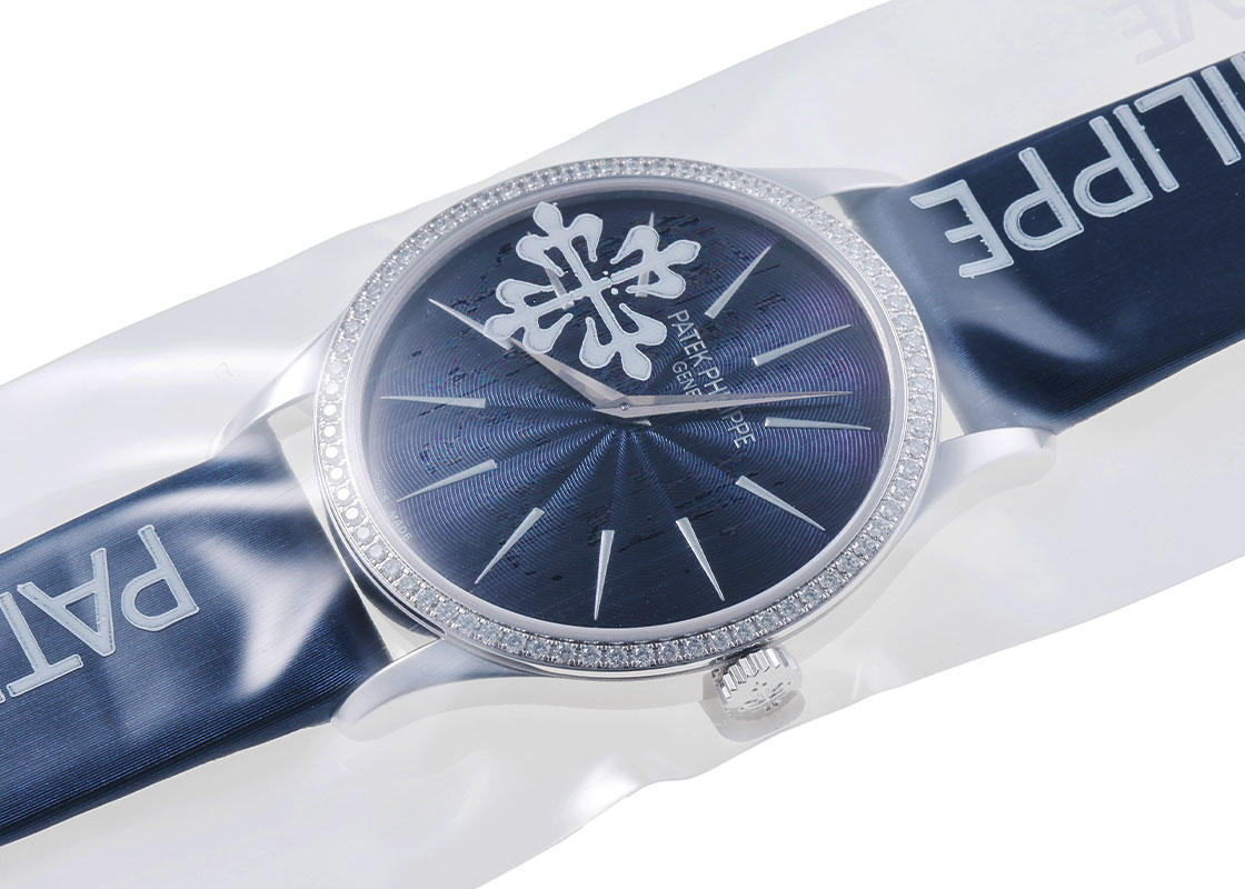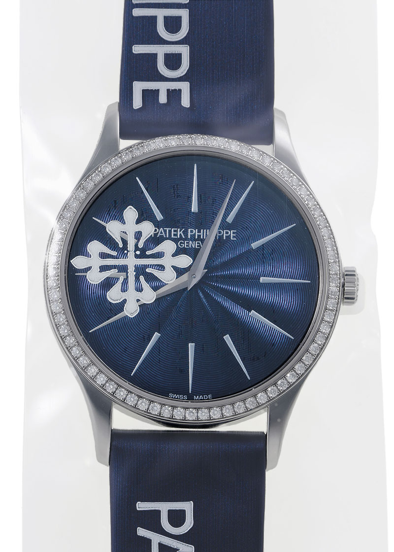 名門マニュファクチュールのパテックフィリップより「カラトラバ ベゼルダイヤ」が入荷しました。 カラトラバはパテックフィリップを代表するラウンドモデル。 1930年代から登場をして数々のドレスウォッチを発表しています。 最後に行き着く時計ともいわれています。 こちらはレディスサイズでケース径は33mm、ベゼルには72個(約0.47カラット)のダイヤモンドがセッティングされています。 上品なギョーシェ彫りのブルー文字盤には鋭く尖った、バーインデックスと針が存在感を放ちます。 提携工房にて外観の傷取り(研磨)、ロジウムメッキ後に、パテックフィリップジャパンにてオーバーホール(機械の分解掃除)とガラス交換を行っております。 さらにパテックフィリップ純正サテンベルトも新品に交換済みです。 パテックフィリップの箱(内箱のみ)と保証書(2017年9月販売)、修理明細書、携帯ケースが付属いたします。 最高の状態でお客様へお渡しするため、メンテナンス後は未開封の状態となっております。 新しく生まれ変わった特別な時計を手にできるのは、ご購入された方のみです。 パテックフィリップ社でメンテナンスをすることで、「他には無い高品質のタイムピース」が出来上がり、初めて手にされる方も安心してお使い頂けます。 世界最高峰ブランドの「メンテナンス後ファーストオーナー」になってみてはいかがですか。 さらに詳しい内容を確認されたい方は、お気軽にお問い合せください。 管理用:owq108