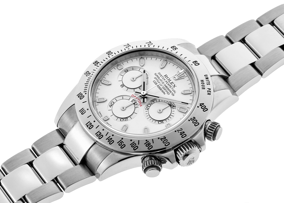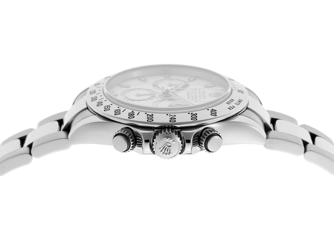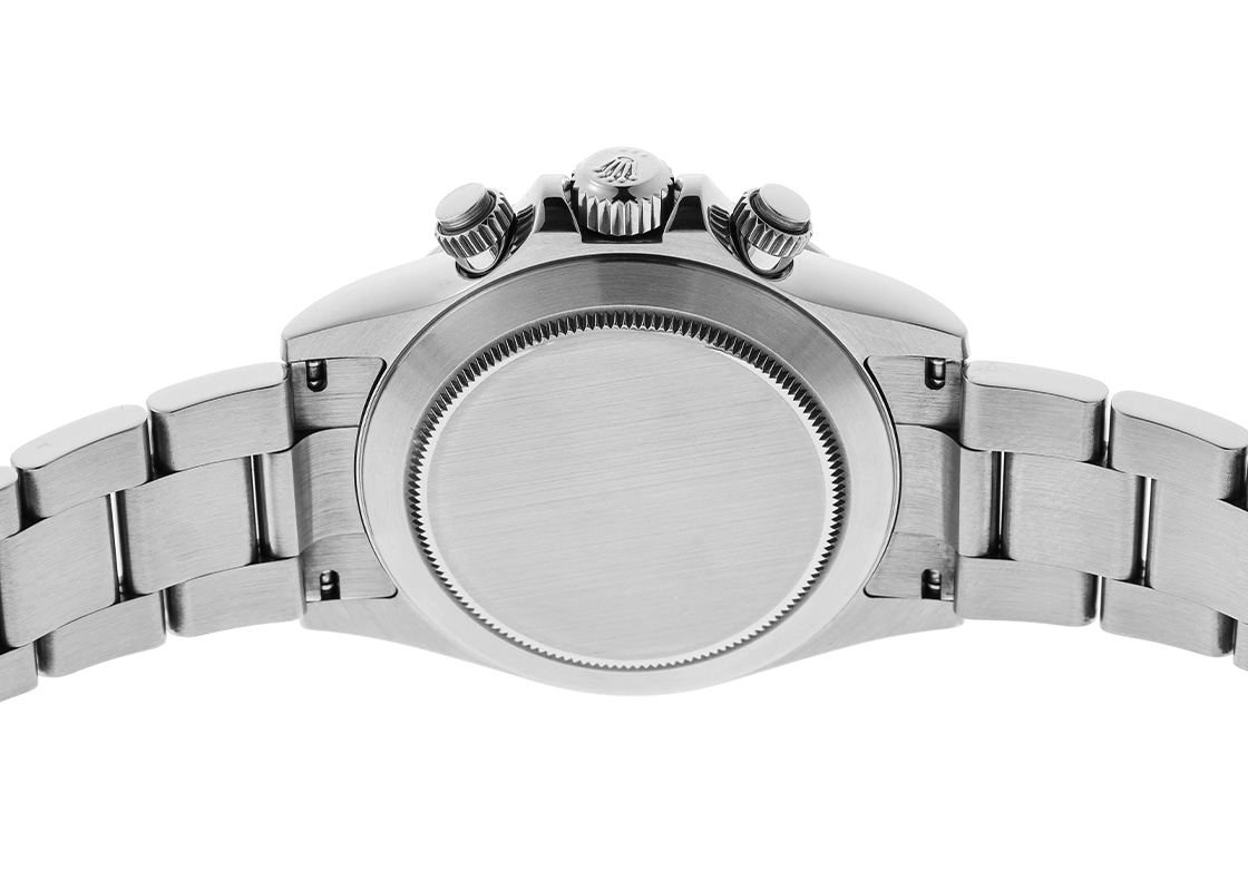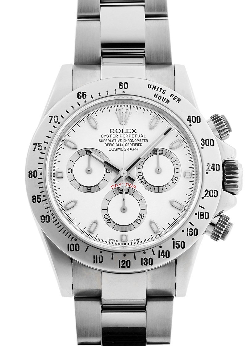 ロレックスより「116520 オイスター パーペチュアル コスモグラフ デイトナ」が入荷しました。 ロレックスのスポーツウォッチの中でも飛びぬけた人気を誇るデイトナ。 今回入荷したモデルは第5世代目にあたる116520の白文字盤。 2000年から2016年頃まで生産され、この世代から自社製自動巻ムーブメントが搭載されています。 ベゼルはステンレス仕様、この後の後継機からセラクロム製になります。 自社製で初搭載となるムーブメントはキャリバー 4130、後継機116500LNでも引き続き搭載されています。 以前のゼニス エルプリメロを元にしたキャリバー 4030に比べパワーリザーブが大幅に向上し72時間になりました。 提携工房にて外装の傷取り(研磨)が完了しております。 バックル内側に変色が見られますが、ご使用に問題ございません。 時計の個体番号はランダム番で、ロレックスの箱と保証書(2015年9月販売)が付属します。 ブレスレットの駒はすべて揃っており、腕周りが約19.5cmの方まで対応いたします。 さらに詳しい内容を確認されたい方は、お気軽にお問い合せください。 管理用:owp889当店では実店舗を含めた複数の店舗で販売を行っております。店頭販売とネット注文の時間差による売り切れの際はご注文をキャンセルさせていただく場合がございます。何卒ご容赦ください。