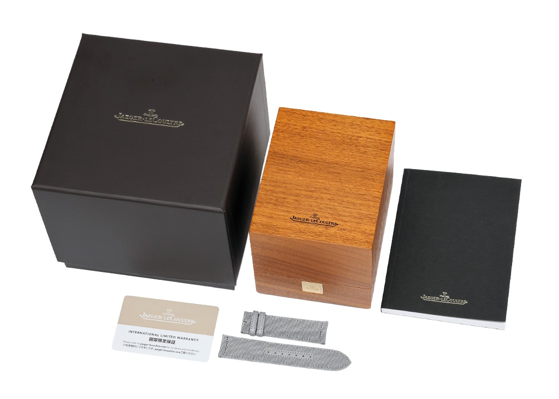 ジャガールクルトの箱と保証書、新品の交換用ファブリックベルトが付属します。