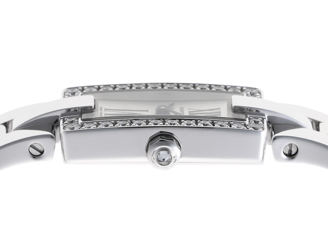 優しく輝くシルバーの文字盤には、12時と6時を示すインデックスとCARTIERのロゴのみの端正な顔立ちとなっており、よりブレスレットのデザインが引き立てられ、アクセサリー感覚でもお使いいただけます。