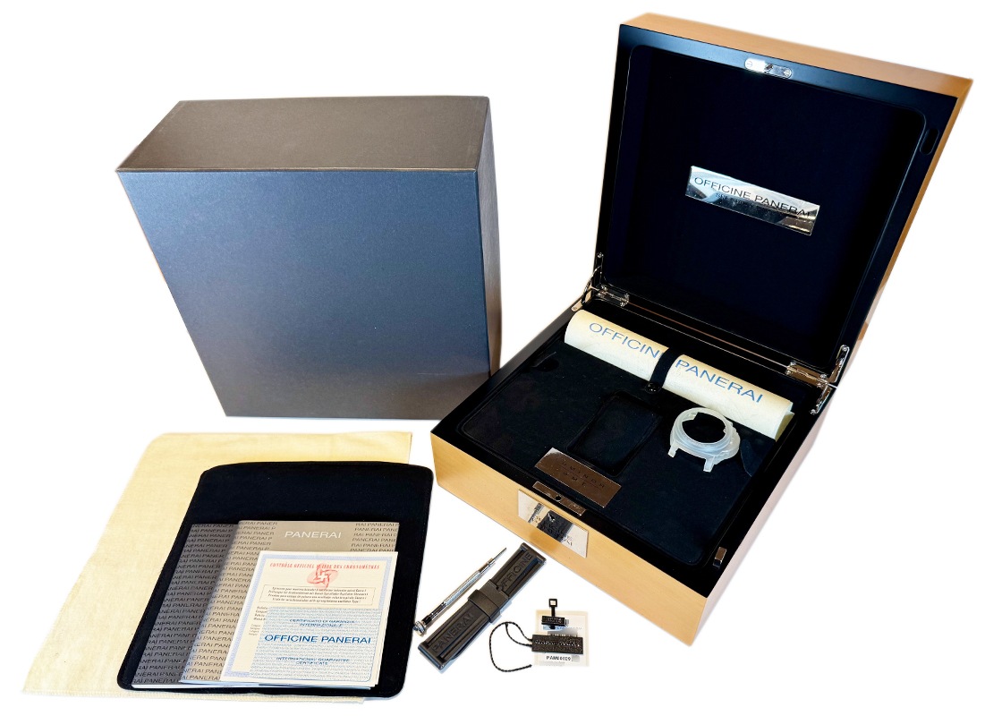 付属品は、箱・保証書(2010年12月)、クロノメーター認定書、パネライ純正のラバーストラップ(USED)、ストラップ交換用のドライバーが付属いたします。