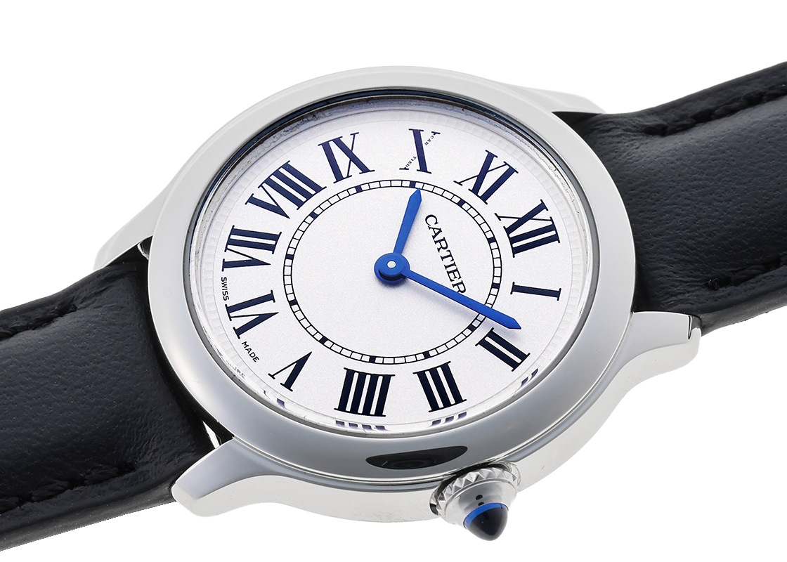 カルティエらしいローマンインデックスとブルースチール針を備え、