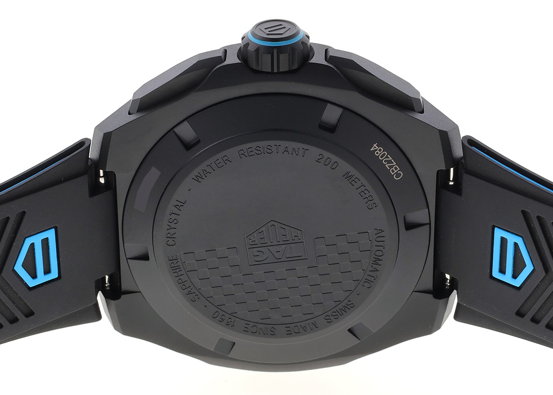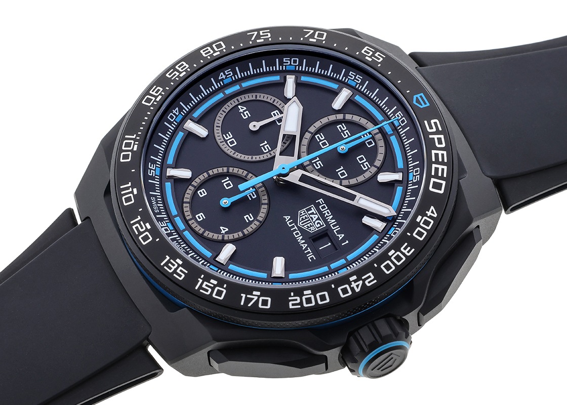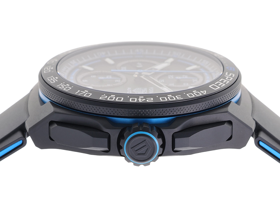 ブラックダイヤルにブルーのアクセントが映え、レーシングスピリットを感じさせる力強い表情に仕上がっています。