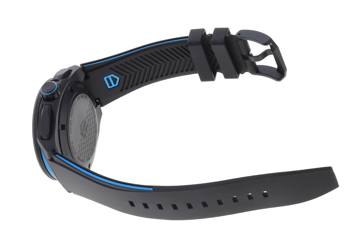 ブラックのラバーストラップのサイドにはケースと同様ブルーの差し色が施され、袖元から覗く姿にも統一感を演出します。