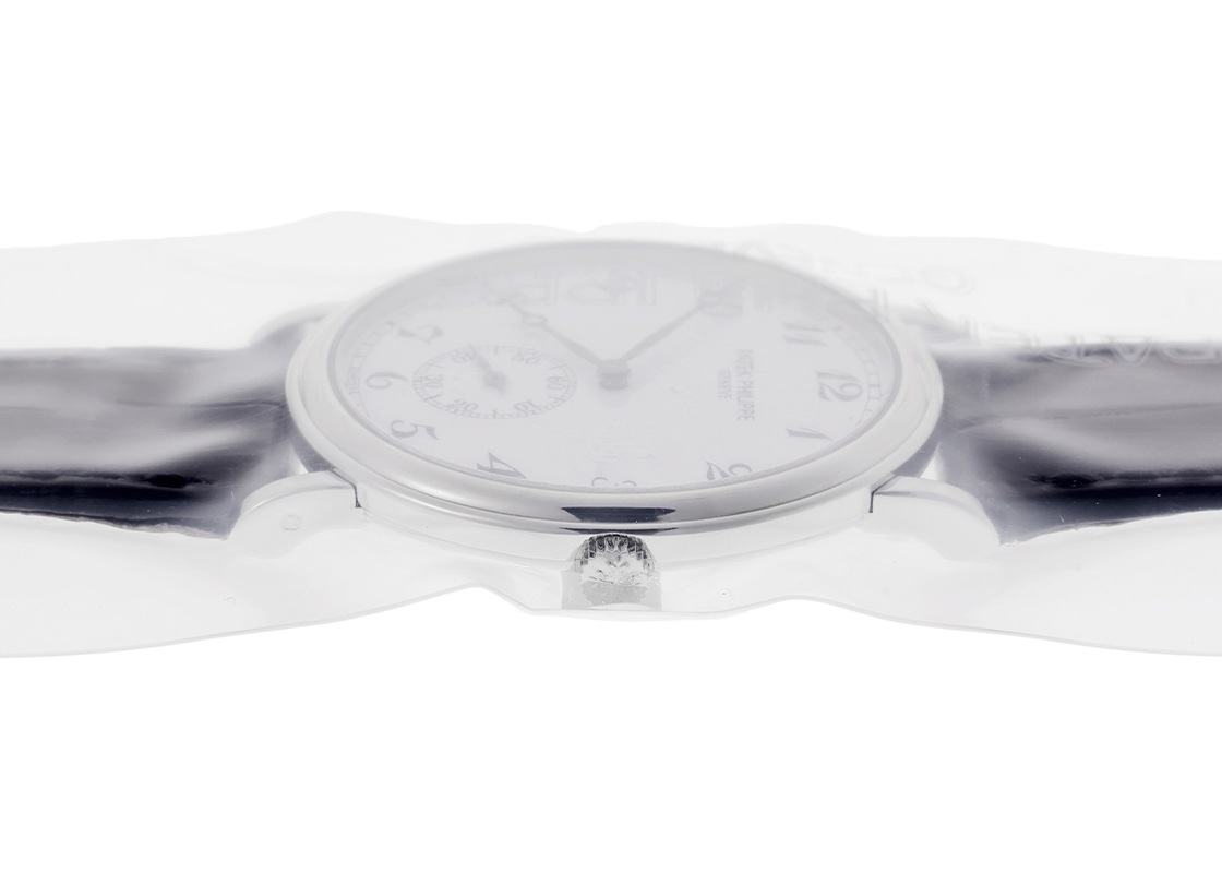 パテック フィリップより、希少なプラチナケースを採用した「カラトラバ Ref.5022P-001」 が入荷いたしました。 カラトラバは1932年、「機能がフォルムを決定する」というバウハウス芸術運動の理念を背景に誕生。 パテック フィリップの哲学を最も純粋に体現する存在であり、腕時計の原型として現在に至るまで揺るぎない地位を築いています。 今回入荷したRef.5022は1997年に登場したモデル。 最大の特徴は、ブレゲ数字とブレゲ針の組み合わせです。 バーインデックスやドーフィン針を用いた王道のカラトラバとは一線を画し、クラシカルでありながらも華やかさを備えた、独自の表情を演出しています。 ケース形状は、初代カラトラバ「クンロク」の系譜とは異なり、直線的なラグを持つRef.3919と同系のフォルムを採用。 一方、ベゼルはクル・ド・パリ装飾ではなくステップベゼルのため、3919と比べるとより穏やかで落ち着いた印象を与えます。 ケース素材にはプラチナを使用。 ゴールド素材が主流のカラトラバにおいて、プラチナケースは展開数自体が限られており、非常に希少です。 控えめでありながら、確かな個性を感じさせる“大人のためのカラトラバ”と呼ぶにふさわしい一本です。 ムーブメントは、手巻き Cal.215 PS を搭載。 約44時間のパワーリザーブを備え、カラトラバやゴンドーロなど、約四半世紀にわたりパテック フィリップの薄型手巻き時計を支えてきた名機です。 コンディションは、当店にて外装の傷取り(研磨)を実施。 さらにパテック フィリップ ジャパンにてオーバーホール(分解掃除)、針・ガラス交換を行っております。 ストラップはパテック フィリップ純正の新品クロコダイルベルトに交換済みです。 付属品は・修理明細書(2026年1月)・サービスケースがございます。 メンテナンス完了後は、真空パック未開封の状態を保っており、どなたの手にも触れていないコンディションです。 また、パテックフィリップの修理保証が2028年1月まで有効なため、安心してご使用いただけます。 さらに詳しい内容を確認されたい方は、お気軽にお問い合せ下さい。 管理用:owq419
