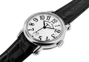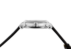 しかし、この「ラウンド」のように、オーソドックスなケースもラインアップされています。エレガントなリーフ型針や6時位置のデイト表示など、非常にシックな表情をもつドレスウォッチです。