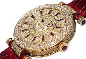 ピンクゴールドのケース、時計全体に無数に散りばめられたダイヤモンド、インデックスに使用されたルビーが織り成す豪華なコントラストがこの上ない優美さを演出しています。