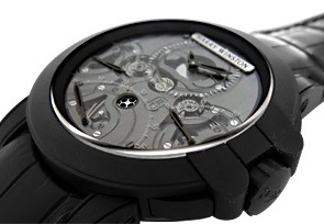 ハリー ウィンストンのタイムピースの中でも大きめの44mmケースには、レトログラード式積算計をオフセンターに配した文字盤が収められています。