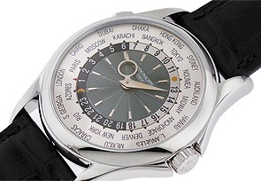 1939年に製造された初代ワールドタイムの後継機ともいえる時計で、こちらのモデルはプラチナ製のケースとシルバー×ブルーのコントラストが美しい逸品。