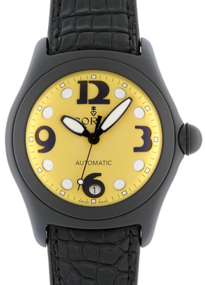 | 2000年にデビュー、たちまちコルムを代表する大ベストセラーモデルとなったバブルシリーズです。 PVDが施された黒色のケースに黄色の文字盤の組み合わせ。 目立つこと間違いなし。 |