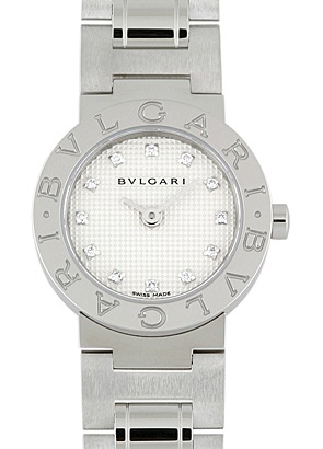 シンプルな形状ながらベゼルに刻印された「BVLGARI」の文字が強い印象を感じる、他にはない唯一無二のデザインが魅力。