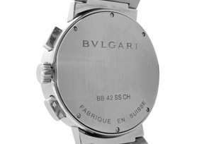 スタンダードなラウンドケースながら、ベゼルに大胆に刻印された「BVLGARI BVLGARI」の文字が強い印象を感じる、他にはない唯一無二のデザインが魅力。